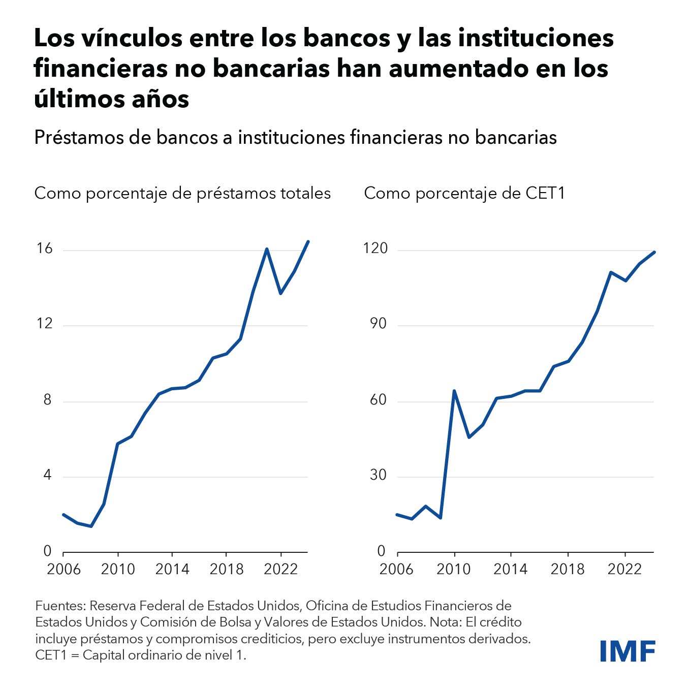 Los bancos de importancia sistémica a escala mundial y otros proveedores de apalancamiento, como las cámaras de compensación de los instrumentos derivados, recurren a diversas herramientas para protegerse del riesgo de quiebra de una IFNB en particular, como requisitos de garantía y acuerdos para reducir las exposiciones brutas. Sin embargo, no pueden controlar la cantidad de deuda que un cliente toma de otros prestamistas. Así, el nexo entre los bancos y las IFNB ha aumentado en los últimos años; por ejemplo, en Estados Unidos, los préstamos de las IFNB han ascendido hasta el 120% del capital ordinario de nivel 1 de los bancos.