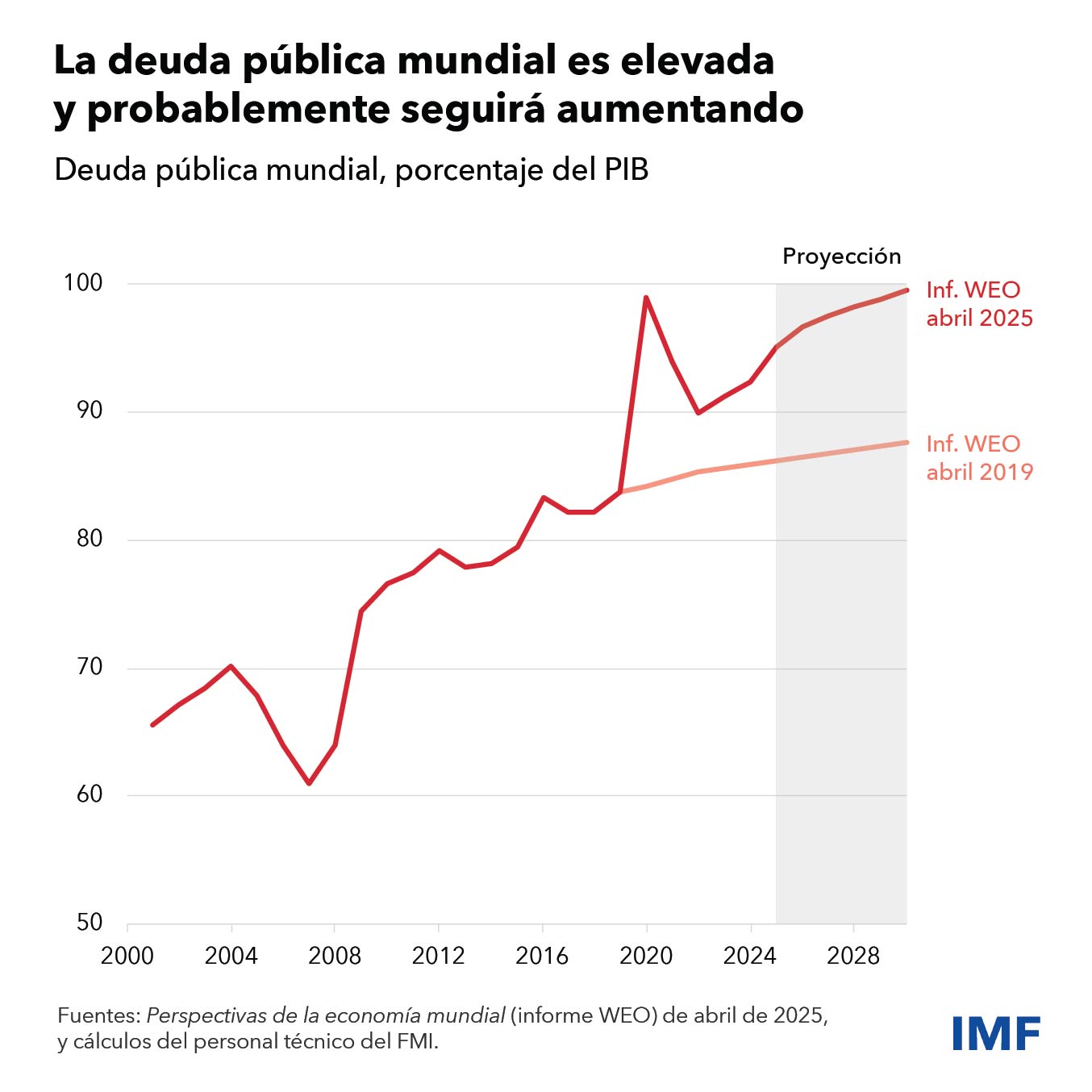 Prevemos que la deuda pública mundial se incremente en 2,8 puntos porcentuales este año —más del doble de las estimaciones para 2024— y se sitúe por encima del 95% del producto interno bruto. Es probable que esta tendencia al alza continúe y que la deuda pública se aproxime al 100% del PIB para el final de la década, superando los niveles alcanzados durante la pandemia. Estas cifras se basan en las proyecciones de referencia de Perspectivas de la economía mundial (informe WEO) y reflejan los anuncios de aranceles realizados entre el 1 de febrero y el 4 de abril. En el contexto de una considerable incertidumbre sobre las políticas y un panorama económico cambiante, los niveles de deuda podrían aumentar aún más.