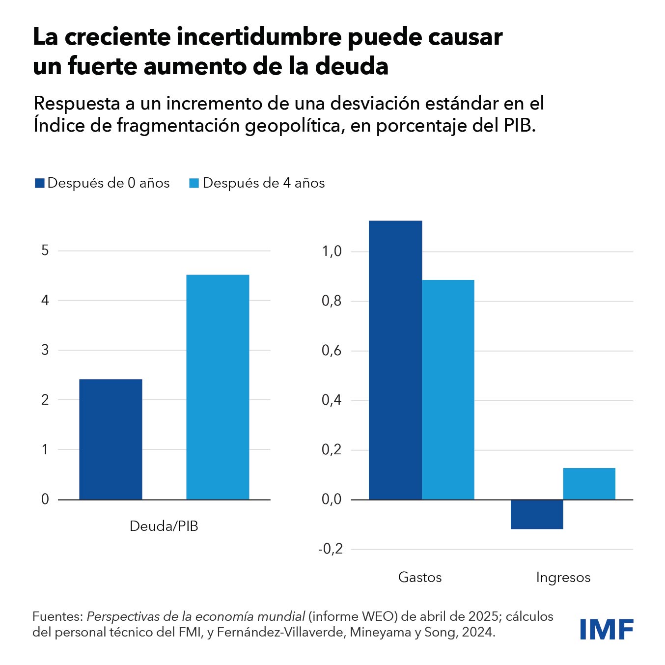 Los riesgos para las perspectivas fiscales han vuelto a intensificarse. Los niveles de deuda pueden situarse incluso por encima de esas estimaciones de deuda en riesgo si los ingresos y el producto económico se reducen mucho más de lo que se prevé actualmente como consecuencia del aumento de los aranceles y el deterioro de las perspectivas de crecimiento. Además, la creciente incertidumbre geoeconómica podría agudizar los riesgos de endeudamiento y elevar la deuda pública como consecuencia del incremento del gasto, en particular en defensa. También podrían aumentar las peticiones de apoyo fiscal para quienes sufren las graves perturbaciones que causan los shocks comerciales, con el consiguiente aumento del gasto. El Monitor Fiscal estima que un aumento significativo de la incertidumbre geoeconómica podría causar un incremento de la deuda pública de aproximadamente un 4,5% del PIB a mediano plazo.