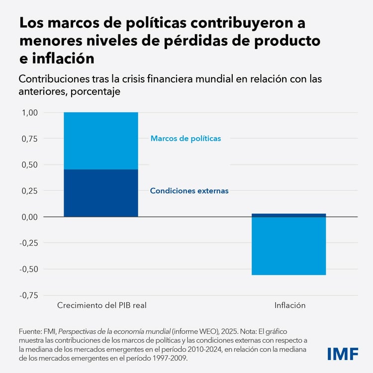 Los marcos de políticas reforzados —como por ejemplo con una política monetaria creíble, bancos centrales más independientes y una política fiscal más transparente— han desempeñado un papel importante, tal y como se muestra en el capítulo del nuevo informe Perspectivas de la economía mundial (informe WEO). Tras comparar episodios típicos de aversión al riesgo antes y después de la crisis financiera mundial, nuestro análisis concluye que estos marcos mejorados han ayudado a reducir las pérdidas de producto y la inflación.