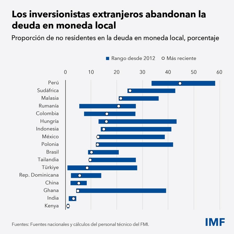 Los mercados emergentes grandes con marcos de políticas sólidos y ahorro interno creciente han podido recurrir más en la emisión de deuda en moneda local y aprovechar una demanda fuerte de los inversionistas internos, sobre todo las instituciones financieras no bancarias. Como resultado, en muchos países la proporción de deuda emitida en moneda local y en manos de inversionistas extranjeros se ha reducido hasta mínimos no registrados en varios años.
