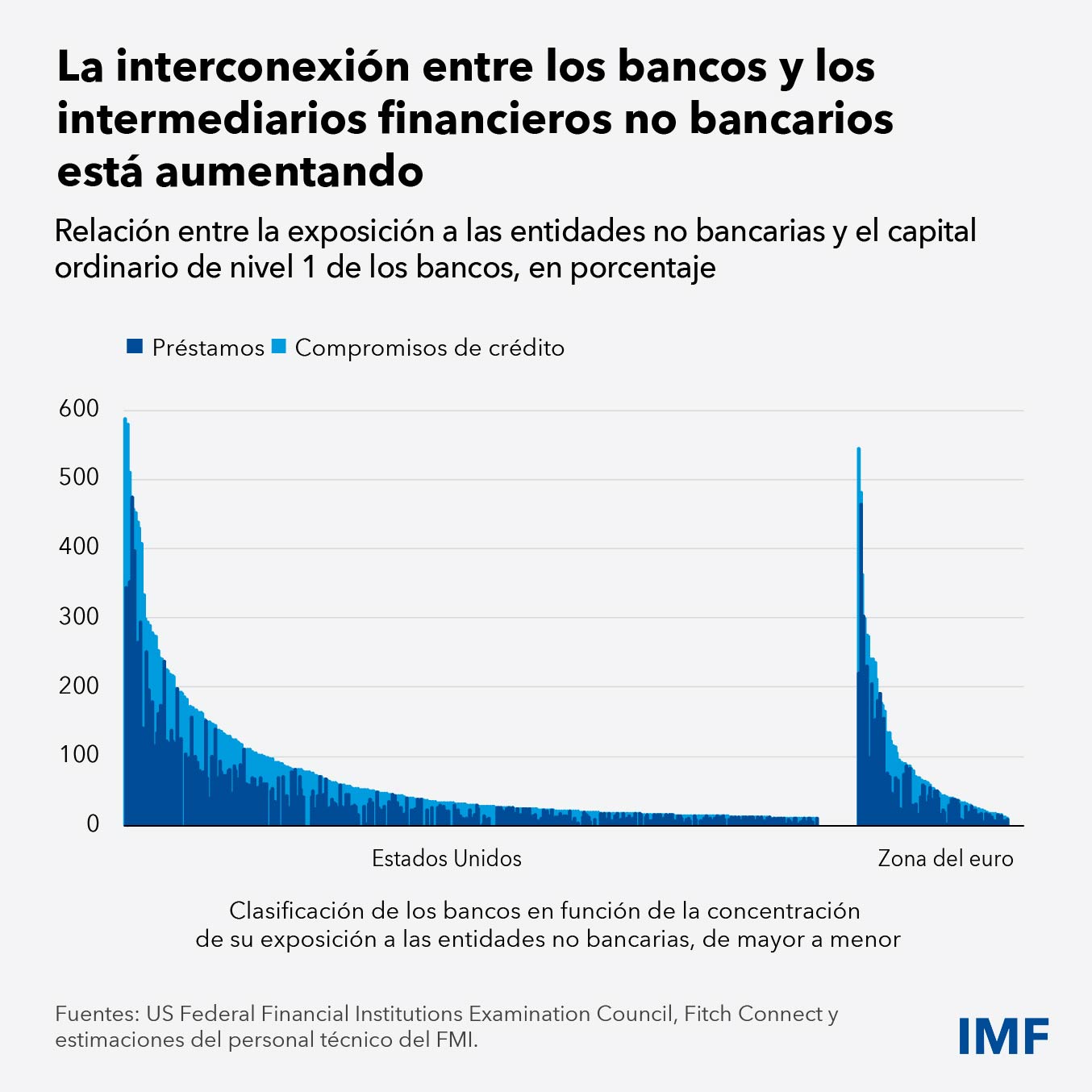 Si bien las instituciones no bancarias pueden facilitar las actividades de los mercados de capitales y canalizar el crédito hacia los prestatarios, su expansión también conlleva un aumento en la asunción de riesgos y en la interconexión entre los distintos actores del sistema financiero. En conjunto, la mitad de los activos financieros en todo el mundo están en manos de instituciones no bancarias. En Estados Unidos y la zona del euro, las exposiciones de muchos bancos a estas instituciones financieras no bancarias superan su capital de nivel 1, un colchón fundamental que permite a los bancos absorber las pérdidas y mantener la estabilidad en épocas de crisis. Del mismo modo, las entidades no bancarias representan la mitad del volumen diario de operaciones en el mercado de divisas, más del doble que hace 25 años, como mostramos en uno de los capítulos analíticos del informe GFSR.