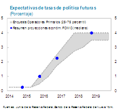 5. Orientación de la política monetaria. Actualmente, la Reserva Federal tiene que enfrentarse a varios ámbitos de incertidumbre: el grado de capacidad ociosa que persiste en los mercados de trabajo estadounidenses; el grado en que esta capacidad ociosa se traducirá en inflación de los salarios y precios en el futuro, y la transmisión a la economía real de un aumento futuro de las tasas de política monetaria. Estas sustanciales ambigüedades conforman un panorama para la política monetaria estadounidense particularmente incierto, como lo ha anunciado repetidamente la Reserva Federal. Esta incertidumbre contrasta con el limitado espectro de opiniones en el mercado sobre la trayectoria de las tasas de política monetaria en el futuro, así como la actual valoración históricamente baja de la volatilidad de precios de los activos. Al mismo tiempo, los rendimientos de las letras del Tesoro a largo plazo y las primas por plazo se han reducido a niveles muy bajos. Esto plantea el riesgo, incluso con un aumento eficaz y bien comunicado de las tasas de interés, de que se produzcan importantes fluctuaciones de los flujos y precios del mercado en los próximos meses. De ocurrir, esta volatilidad tendría implicaciones que podrían ir mucho más allá de las fronteras de Estados Unidos, lo que podría afectar a aquellos países con fundamentos económicos más débiles y esto, a su vez, podría tener efectos de segunda ronda en el crecimiento de Estados Unidos. En el escenario base presentado por el personal técnico, se prevé que la economía alcance el pleno empleo recién a finales de 2017 y que las presiones inflacionarias se mantengan moderadas. Si esto ocurre, las tasas de política monetaria podrían mantenerse en un nivel cero por mucho más tiempo que la fecha de mediados de 2015 prevista actualmente por los mercados. Sin embargo, la política económica debería seguir teniendo en cuenta los riesgos para la estabilidad financiera, en particular aquellos que son intrínsecamente difíciles de contener a través de los instrumentos de regulación y supervisión disponibles. Si la inflación aumenta más rápidamente de lo previsto y la economía se mantiene aún muy por debajo del pleno empleo, tolerar un aumento temporal y modesto de la inflación por encima del objetivo a más largo plazo podría ser coherente con el enfoque equilibrado de la Reserva Federal, siempre que las expectativas de inflación permanezcan ancladas y los riesgos para la estabilidad financiera sean bajos.