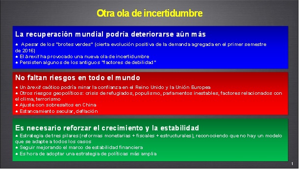“El voto a favor del brexit implica un aumento sustancial de la incertidumbre económica, política e institucional, la cual se proyecta que tenga consecuencias macroeconómicas negativas, sobre todo en las economías avanzadas de Europa”, según la Actualización de las Perspectivas de la economía mundial del FMI publicada hoy.