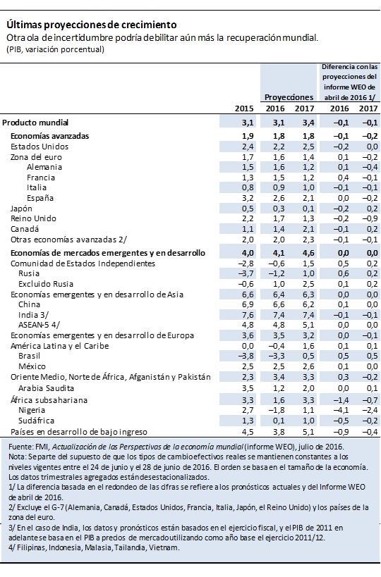 El FMI proyecta un crecimiento de la economía mundial del 3,1% en el presente año y 3,4% en 2017 (veáse el cuadro). Estos pronósticos representan una revisión a la baja de 0,1 puntos porcentuales para ambos años con respecto a la edición de abril de Perspectivas de la economía mundial (informe WEO, por sus siglas en inglés) del FMI.