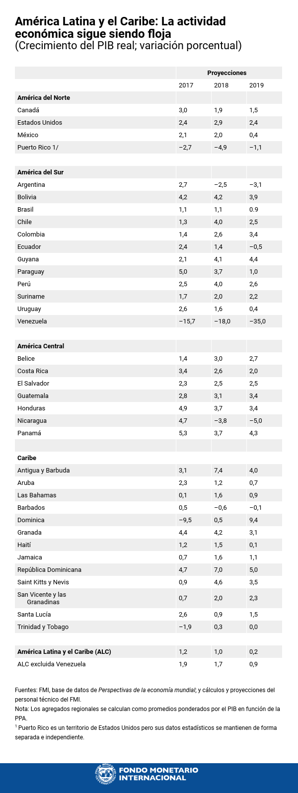 El crecimiento en América Latina y el Caribe se está desacelerando. Se espera que la región crezca un 0,2 por ciento este año, en medio de continuas tensiones comerciales, un menor crecimiento mundial, precios moderados de las materias primas en América Latina, y una fuerte incertidumbre en torno a las políticas económicas en algunas economías importantes.