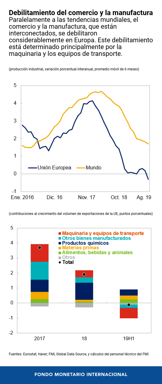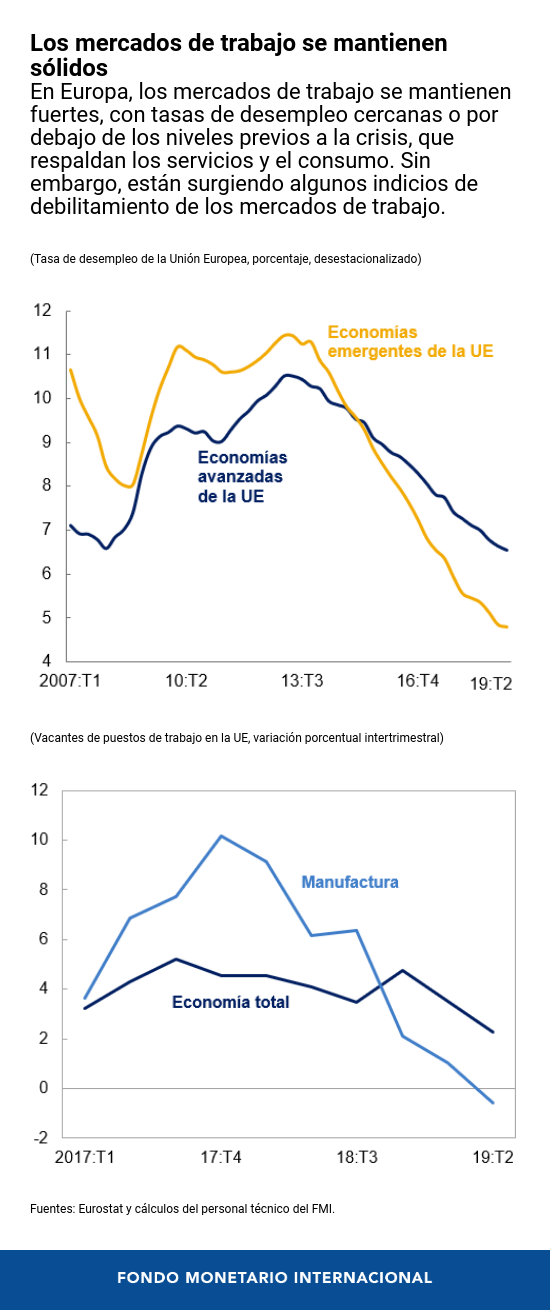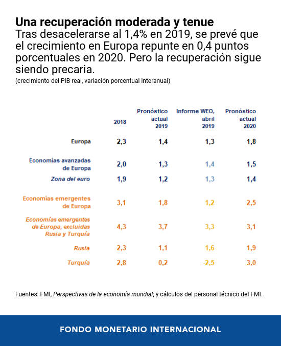 Perspectivas económicas de Europa.En conjunto, se proyecta que el crecimiento en Europa se reducirá del 2,3% en 2018 al 1,4% en 2019. Se prevé una recuperación moderada y precaria para 2020 ya que se espera que el repunte de la demanda externa limite los incipientes efectos de contagio en la inversión y los servicios. Esta proyección, que coincide básicamente con las proyecciones de la edición de abril de 2019 de Perspectivas de la economía mundial (informe WEO), oculta importantes diferencias entre las economías avanzadas y las economías emergentes de Europa.