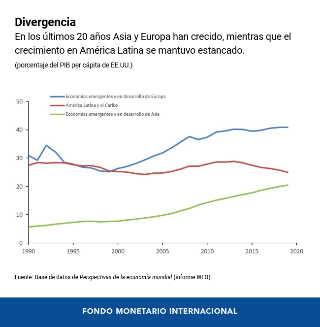 En 1990, el PIB promedio per cápita de América Latina era poco más de un cuarto del nivel de ingreso de Estados Unidos, en tanto que el de las economías emergentes y en desarrollo de Asia era apenas 5%. En 2019, los países asiáticos habían cuadruplicado su crecimiento, pero América Latina se situaba en el mismo nivel.