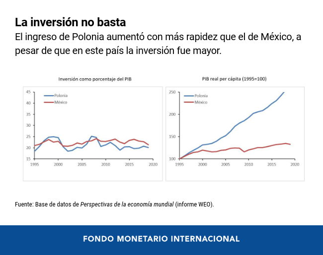 Tomemos el caso de México y Polonia. En los 25 últimos años, México ha tenido más inversiones (como porcentaje del PIB), pero su crecimiento per cápita ha sido mucho más lento. ¿A qué se debe esa situación?