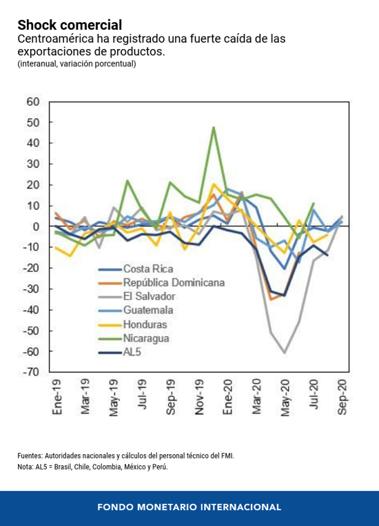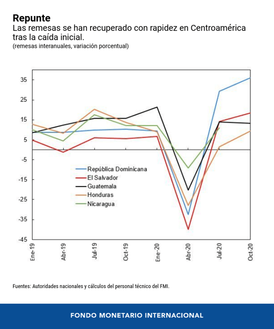 Diversos factores han contribuido a mitigar el doble shock climático y sanitario, en especial el buen desempeño agrícola y, desde mayo, el importante repunte de las remesas, de las que dependen considerablemente muchos países centroamericanos. El descenso de los precios del petróleo ha beneficiado a la región, que es importadora neta. Las exportaciones de equipos médicos han compensado en parte la caída del turismo en Costa Rica.