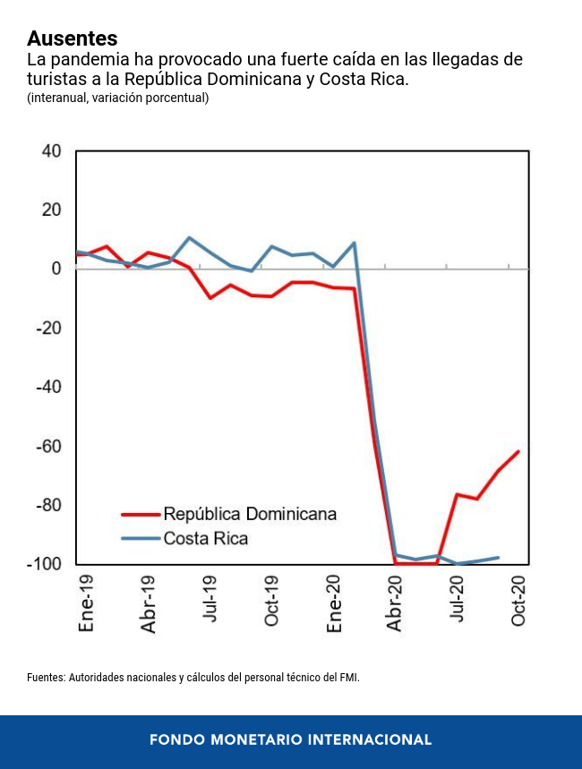 Las llegadas de turistas cayeron con fuerza en Costa Rica y en la República Dominicana, donde los ingresos por turismo representaban entre el 6 y el 10 por ciento del PIB antes de la pandemia.