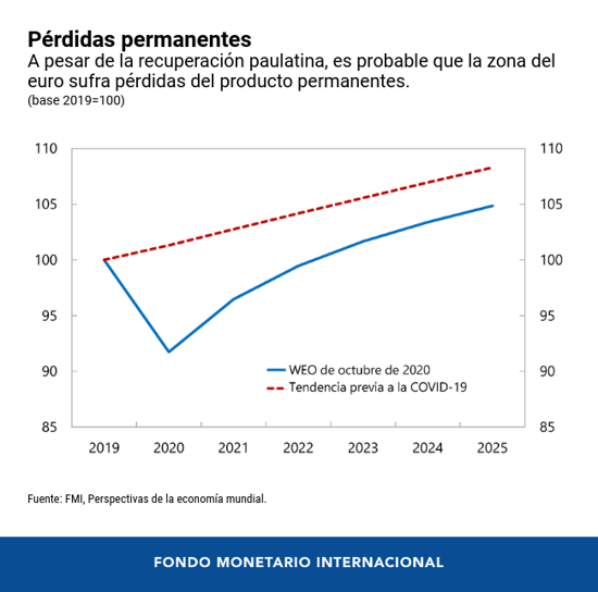 - A medida que la zona del euro emprende la larga senda hacia la recuperación, las políticas deberían reorientarse de un respaldo amplio hacia medidas más focalizadas. A medida que la recuperación se afianza y se levantan las restricciones a la actividad, las políticas deberían respaldar la transición al nuevo mundo pospandémico. Las empresas cuyas operaciones se han visto trastocadas por la pandemia quizá necesiten solvencia de respaldo para poder atravesar la crisis. A medida que se vayan levantando las medidas de contención, correspondería eliminar poco a poco los programas de jornadas de trabajo reducidas y dedicar más recursos para ayudar a los trabajadores a pasar a empresas y sectores en expansión. También es necesario apuntalar la demanda agregada, sobre todo incrementando la inversión pública productiva, que reducirá los efectos negativos a largo plazo de la crisis.