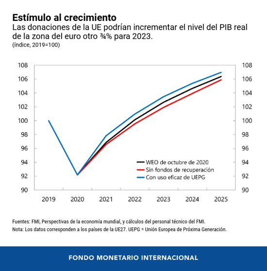 - Los fondos de recuperación de la UE podrían desempeñar un papel crítico en la aceleración de las transiciones verde y digital y en el estímulo del crecimiento potencial. Los €750.000 millones del Fondo de Recuperación de la UE de Próxima Generación —€390.000 millones de los cuales son en forma de donaciones— deberían servir para catalizar la inversión en la reducción de emisiones de carbono y mejorar la productividad a través de la digitalización. Se prevé ya que las donaciones incrementarán el nivel del PIB real de los países de la UE en ¾% para 2023; si se les da un uso eficaz, su impacto podría duplicarse. El programa podría tener un impacto aún más fuerte si los países implementaran ambiciosas reformas estructurales críticas en sus planes de recuperación.