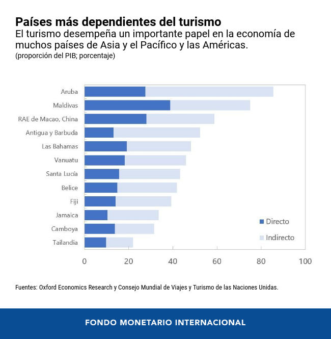 Esto ha tenido graves repercusiones para muchos países en desarrollo de Asia-Pacífico y las Américas , en particular, para pequeños estados insulares. Antes de la pandemia, el turismo era una actividad sumamente importante, que generaba más del 10% del PIB mundial. Un porcentaje que era aún mayor en el caso de los países dependientes del turismo.