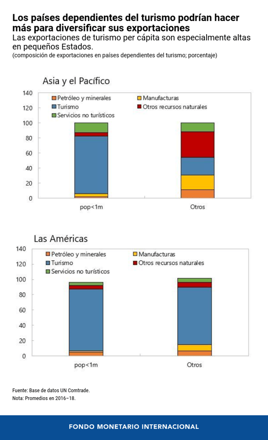 Por último, si la reducción de los viajes perdura como consecuencia de cambios en las preferencias de los viajeros o de las cicatrices económicas, es posible que algunos países dependientes del turismo se vean obligados a iniciar un complicado camino hacia la diversificación de sus economías. La inversión en otros sectores distintos del turismo es un objetivo a largo plazo, pero podría favorecerse reforzando los vínculos entre el turismo y la agricultura, las manufacturas y el entretenimiento de producción local. En Jamaica, por ejemplo, se ha puesto en marcha una plataforma en línea que permite a los clientes del sector hotelero comprar productos directamente a agricultores locales. Además, se podrían ampliar las exportaciones, incluidas las de servicios, por medio de acuerdos regionales que permitan superar las limitaciones que imponen economías de escala pequeñas.