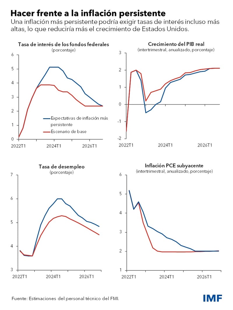 La economía de Estados Unidos se ha recuperado con rapidez de la pandemia; sin embargo, el repunte de la demanda ha provocado tensiones en las cadenas de suministro y un fuerte aumento de la inflación. Con el endurecimiento de la política monetaria por parte de la Reserva Federal (la Fed) y el final de los programas de alivio económico relacionados con la COVID-19, se prevé que la economía se desacelere, lo que reducirá la inflación del gasto de consumo personal (PCE, por sus siglas en inglés) subyacente hasta el 2 por ciento, el objetivo a mediano plazo de la Fed, para finales de 2023. Sin embargo, si la inflación persiste más de lo esperado, la Fed tendrá que aplicar una política monetaria más restrictiva, lo que desacelerará más la economía.