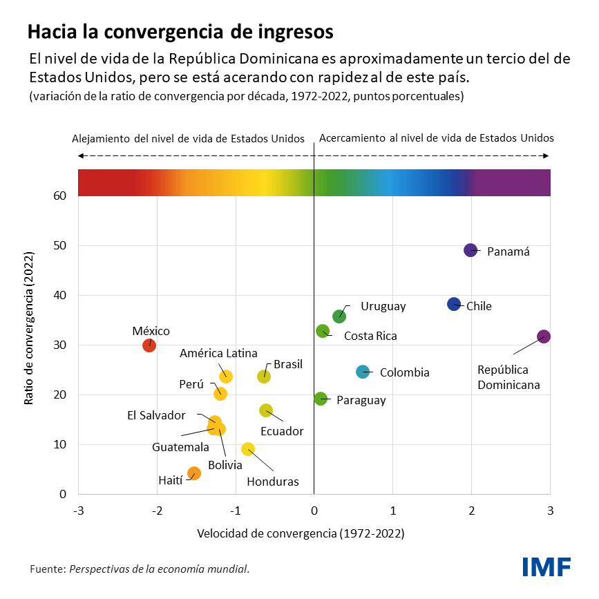 La convergencia de la renta se mide típicamente comparando la renta per cápita de un país con la de una nación más próspera, a menudo Estados Unidos.  Para la República Dominicana, esta ratio alcanzó el 32% en 2022, lo que indica que el nivel de vida del país es aproximadamente un tercio del de Estados Unidos. Esto contrasta con América Latina en su conjunto, donde el nivel de vida medio es aproximadamente un cuarto del de Estados Unidos.