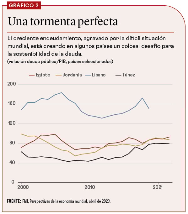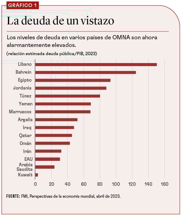 Se está gestando una tormenta de deuda en partes de Oriente Medio y Norte de África (OMNA). La deuda ha venido escalando en toda la región, llegando a niveles muy altos en varios países (gráfico 1). Egipto, Jordania y Túnez se encuentran en una situación precaria, con su estabilidad económica tambaleándose ante las perspectivas de una crisis de deuda. El Líbano, ya tratando de recuperarse de una de las peores crisis económicas de la historia, es un ejemplo aleccionador. Su caída en incumplimiento ha puesto crudamente de manifiesto los agudos desafíos relacionados con la deuda que enfrentan esos países y sus ramificaciones más generales.