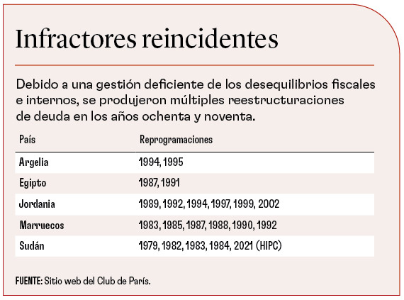 Las reestructuraciones son ahora más difíciles que antes por varias razones. Primero, el ascenso de China y otros acreedores no pertenecientes al Club de París significa que la base de acreedores oficiales está más fragmentada. Aunque los créditos de China por préstamos a países de OMNA altamente endeudados no son sustanciales, su surgimiento como acreedor mundial preponderante hace que, en general, el proceso de reestructuración sea más politizado, lento y complejo. Segundo, los acreedores privados han mostrado reticencia y tardanza en proporcionar alivio de la deuda. Tercero, el nivel de deuda interna pendiente en un número significativo de países de OMNA —Egipto es un ejemplo prominente— es considerable. En el futuro, puede que los acreedores soliciten un perímetro ampliado de reestructuración para incluir dicha deuda. Sin embargo, la mayor parte de esa deuda interna está en manos de fondos de pensiones y bancos locales, lo cual hace su inclusión particularmente problemática.