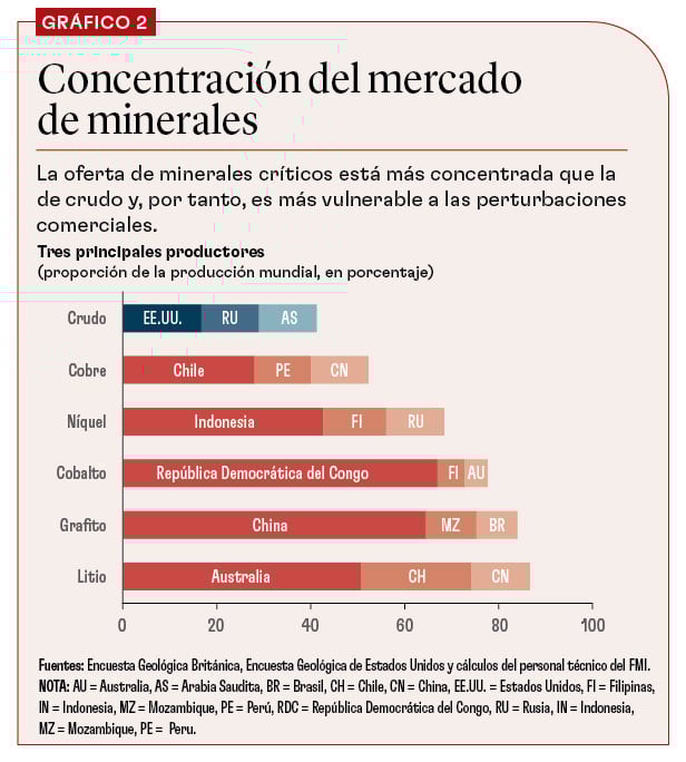 Los minerales como el cobre, el níquel, el cobalto y el litio son insumos críticos para la transición energética. Se emplean en VE, baterías y cableados, y en tecnologías de energía renovable como los paneles solares y las turbinas eólicas. Por ejemplo, una batería para VE normal suele necesitar unos 8 kg de litio, 35 kg de níquel y 15 kg de cobalto. Las estaciones de carga suelen requerir grandes cantidades de cobre. Los minerales críticos son extremadamente vulnerables a las perturbaciones comerciales, ya que su producción mundial está muy concentrada. Dos tercios del cobalto mundial se extraen solo de minas de la República Democrática del Congo. Los tres principales productores de níquel y litio controlan más del 60% de la oferta. En comparación, la producción de petróleo crudo está mucho más diversificada (gráfico 2).