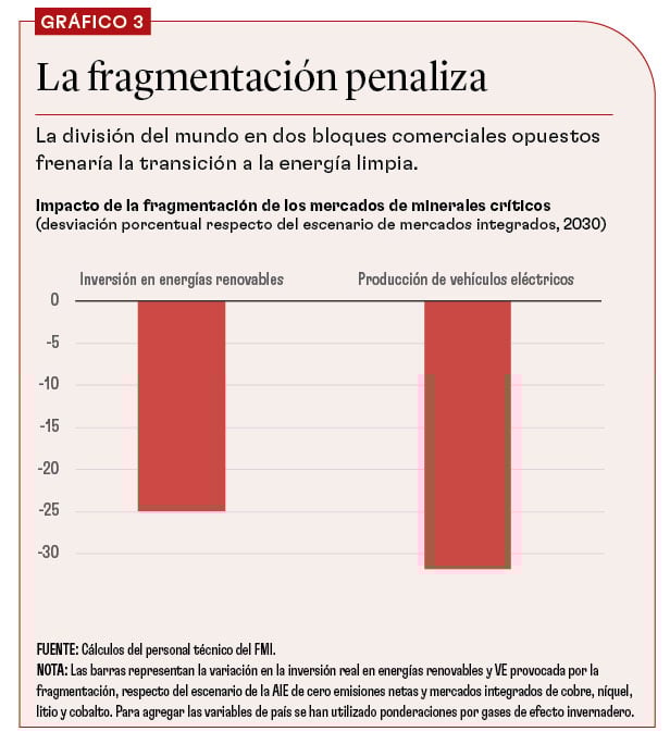 La carrera entre potencias enfrentadas para asegurarse el acceso a minerales estratégicos podría contribuir a las presiones sobre los precios e incrementar el costo de la transición climática. En términos amplios, las nuevas barreras comerciales de los mercados de materias primas se han duplicado desde la invasión rusa de Ucrania, ya que los productores imponen restricciones al transporte. Los minerales críticos usados en la fabricación, ya sea de vehículos eléctricos (VE), paneles solares o turbinas eólicas, son muy vulnerables a las restricciones comerciales más severas. Derivar en bloques comerciales opuestos podría retrasar considerablemente la transición energética.