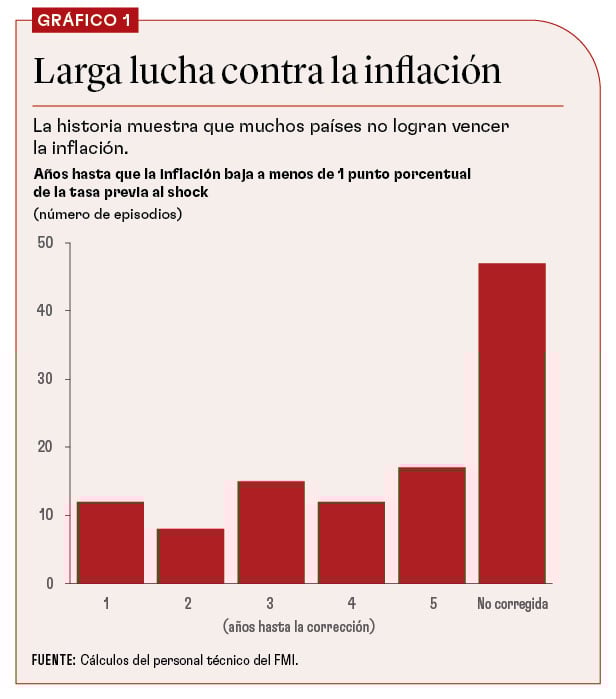 Nuestro estudio de más de 100 shocks inflacionarios ocurridos desde los años setenta llama a la cautela por dos razones. Primero, la historia nos enseña que la inflación es persistente. “Corregir” la inflación y volver al nivel previo al shock lleva años. El 40% de los países de nuestro estudio no lo lograron incluso después de cinco años, y al 60% restante le llevó un promedio de tres años (gráfico 1).