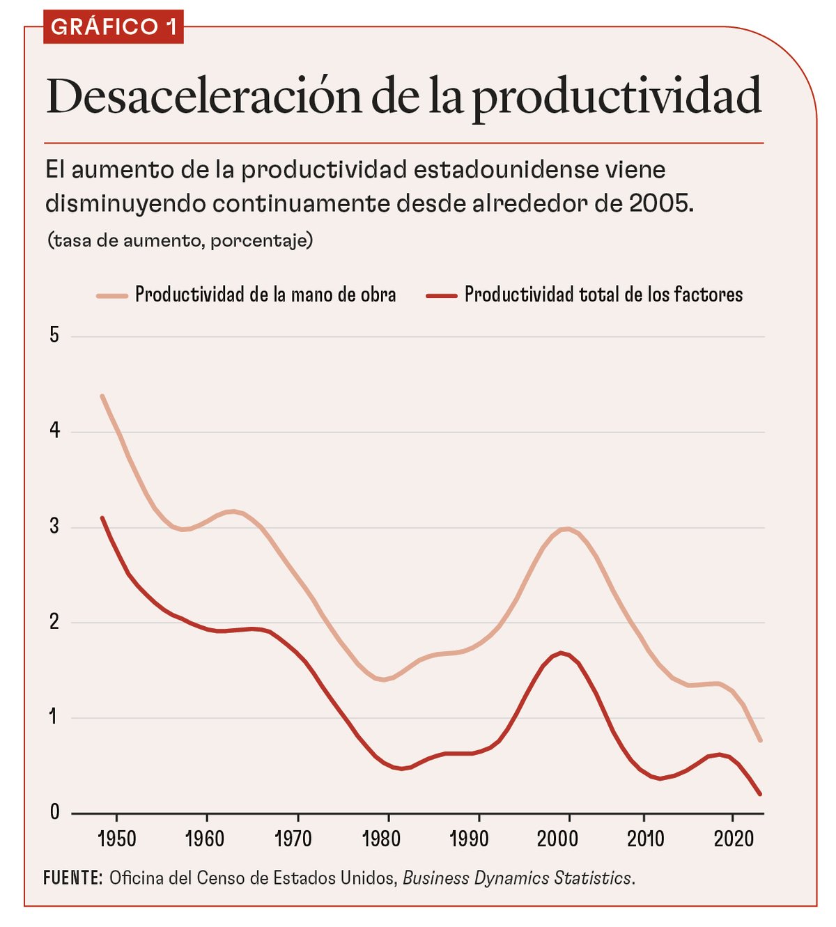 Hay crecientes indicios de que la economía estadounidense está perdiendo dinamismo. La creación de empresas es un aspecto crítico del dinamismo del sector. Suele medirse por la tasa de ingreso —la proporción de empresas que comenzaron a operar en un año determinado—, que cayó del 13% en 1980 al 8% en 2018, según la Oficina del Censo de Estados Unidos. Por otra parte, las empresas crecieron sustancialmente, con un número promedio de empleados que pasó de 20 a 24 en el mismo período. Eso significa que las empresas más antiguas y más grandes generan hoy una proporción mucho mayor de la actividad económica. Estas tendencias apuntan a una pérdida significativa de dinamismo en la economía estadounidense a lo largo de casi cuatro décadas y plantean dos cuestiones críticas. Primero, ¿por qué se correlaciona la pérdida de dinamismo empresarial con una ralentización de la productividad? Segundo, ¿cuáles son los factores fundamentales que impulsan estas tendencias?