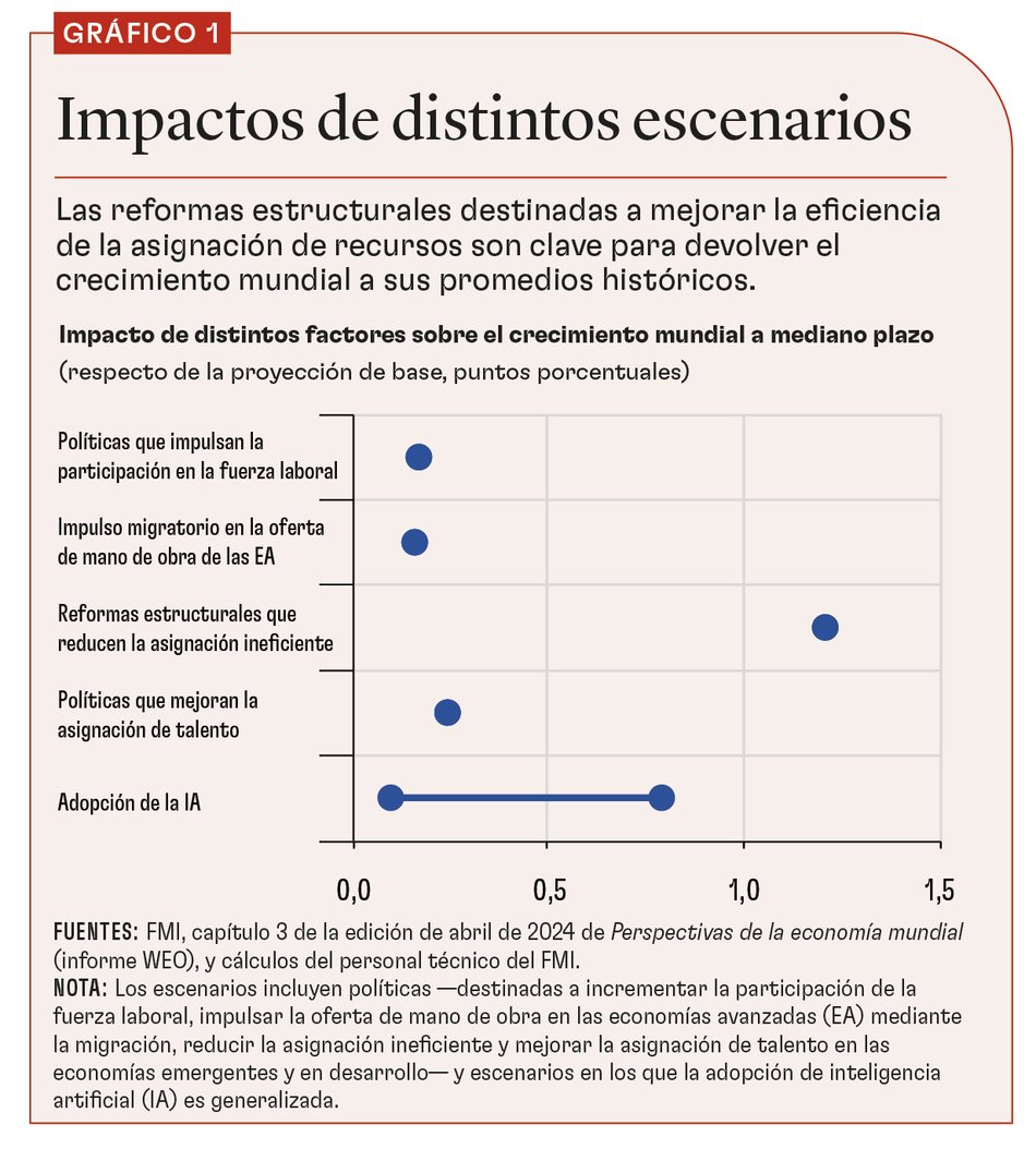 Calculamos que si los países menos eficientes redujeran la distancia con Estados Unidos en tan solo un 15%, crecerían la productividad y la inversión, agregando aproximadamente 1,2 puntos porcentuales al crecimiento mundial anual. Las reformas estructurales que reducen las barreras regulatorias y la rigidez del mercado laboral, y que solucionan los problemas de acceso a financiamiento, son fundamentales para lograrlo.