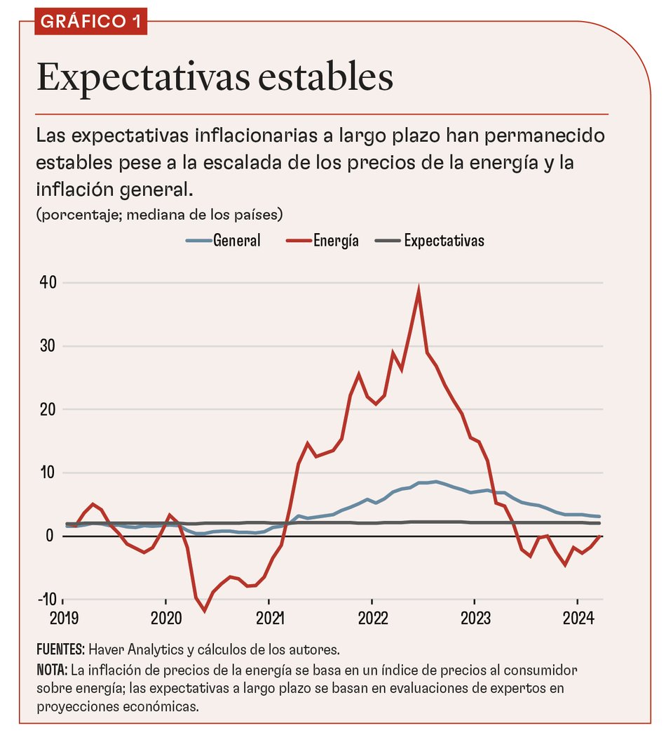 La política monetaria también ha sido decisiva para doblegar la inflación. Durante este período, las expectativas de inflación a largo plazo permanecieron bien ancladas. Esto hace pensar que los bancos centrales preservaron la credibilidad y que eso ayudó a evitar espirales de precios y salarios. El endurecimiento mundial de la política monetaria también puede haber ayudado a moderar la demanda mundial y por ende los precios de la energía. Al mismo tiempo, los shocks energéticos y los efectos de traspaso, y su retroceso, representan el grueso del aumento y el descenso de la inflación, sin que ello deviniera en una profunda desaceleración económica. Pero aun así, en el caso de Estados Unidos, las sólidas condiciones macroeconómicas han contribuido más a la inflación subyacente que en otros países. Desde marzo de 2024, que es cuando concluye nuestra muestra, las condiciones en el mercado laboral estadounidense se habían moderado más, y eso debería ayudar a que la inflación retorne al nivel fijado como meta.