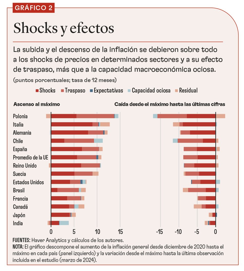 Al unir las distintas piezas, estimamos las respectivas contribuciones de los shocks de la inflación general, su traspaso a la inflación subyacente, indicadores más generales de capacidad macroeconómica ociosa y cambios en las expectativas a largo plazo al ascenso y descenso de la inflación en los diferentes países.