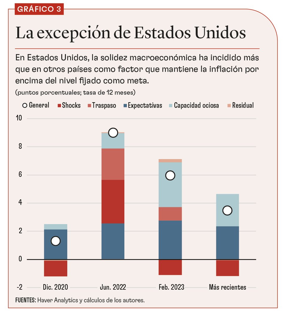 Estados Unidos es una notable excepción. La contribución de la tensión macroeconómica general a la inflación sigue siendo mayor que en otras economías, pese al considerable enfriamiento del mercado laboral desde comienzos de 2023. El descenso de la inflación general en Estados Unidos desde febrero de 2023 obedece tanto al enfriamiento de la economía en términos más amplios como a la disipación de los efectos de traspaso de anteriores shocks de la inflación general (gráfico 3).