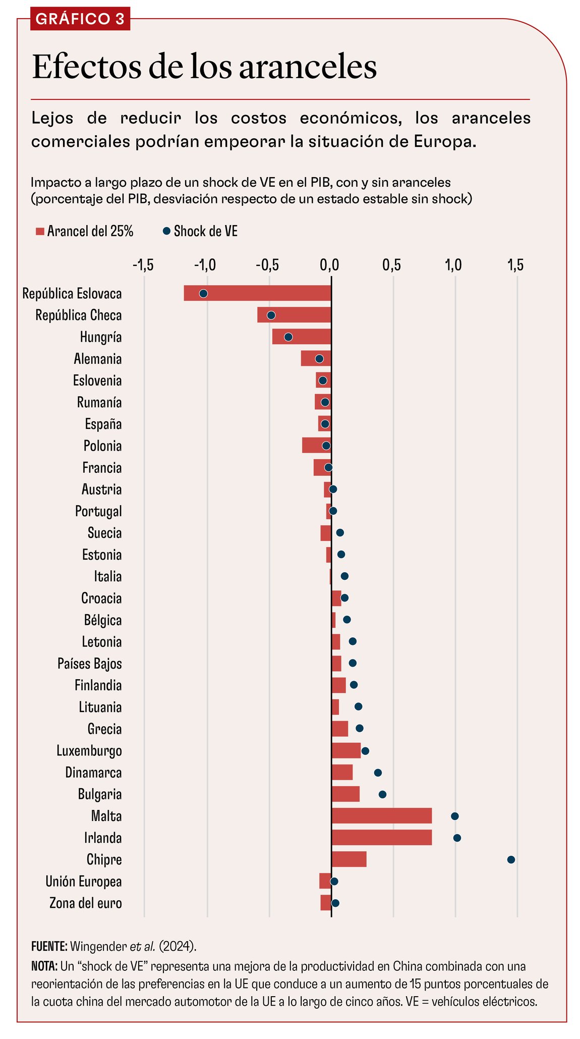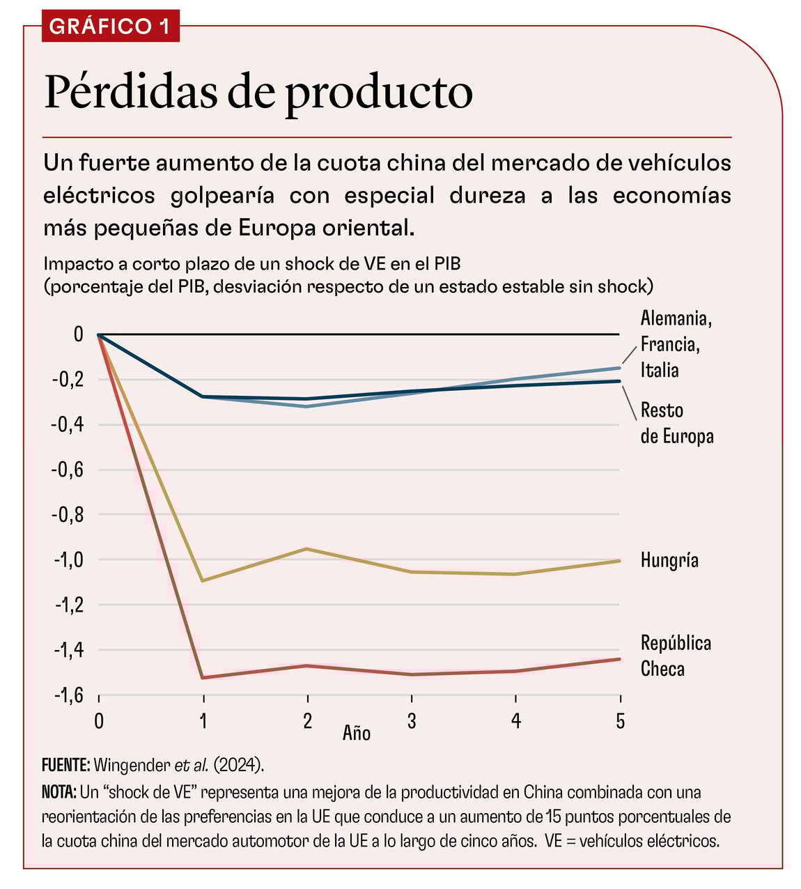 Según nuestros cálculos, el impacto de un shock de VE en el PIB es muy pequeño en la UE en conjunto, pero varía mucho entre sus distintos Estados miembros (gráfico 1). Aquí actúan dos fuerzas contrapuestas. El aumento de la oferta de vehículos chinos baratos beneficia a los consumidores de toda la UE, pero reduce la demanda de automotores de fabricación europea, un sector económicamente importante gracias al elevado nivel de rentabilidad y de productividad de la mano de obra. La pérdida de ingresos resultante es modesta en Alemania, Francia e Italia, ya que, aun siendo la cuna de importantes marcas automotoras, son economías grandes y muy diversificadas. En cambio, el golpe más duro sería para países más pequeños de Europa oriental, cuya actividad económica depende en gran medida de la fabricación dentro de la cadena de suministro de vehículos europeos. Nuestros resultados muestran que Hungría y la República Checa serían las economías más afectadas y sufrirían una caída del PIB real del 1% y el 1,5% a lo largo de cinco años, respectivamente.