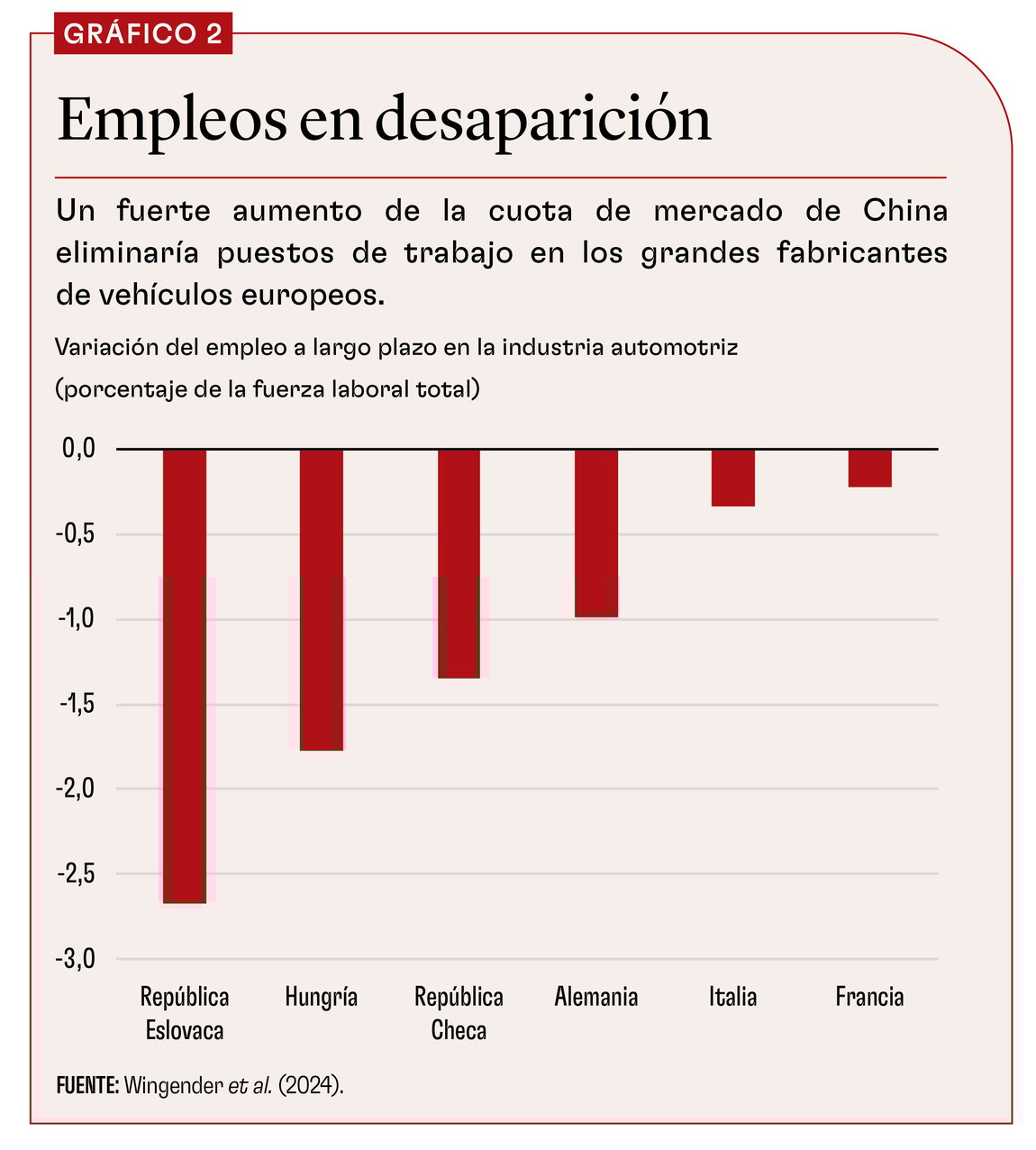 Nuestra hipótesis supone que el avance de China podría producir un efecto transformativo similar y que su cuota del mercado de la UE podría aumentar 15 puntos porcentuales en ausencia de impedimentos comerciales, aunque a lo largo de un plazo más breve. Esta no es una proyección, sino una hipótesis ilustrativa, ya que es poco probable que la penetración china en el mercado de la UE sea exactamente igual a la de Japón en Estados Unidos. Como la UE ya ha impuesto nuevos aranceles a los VE chinos, en algunos casos de hasta el 45%, la escalada de las importaciones chinas quizá no sea tan marcada; por otra parte, podría terminar siendo más vigorosa si China resulta un productor más dominante que Japón en el sector automotor.