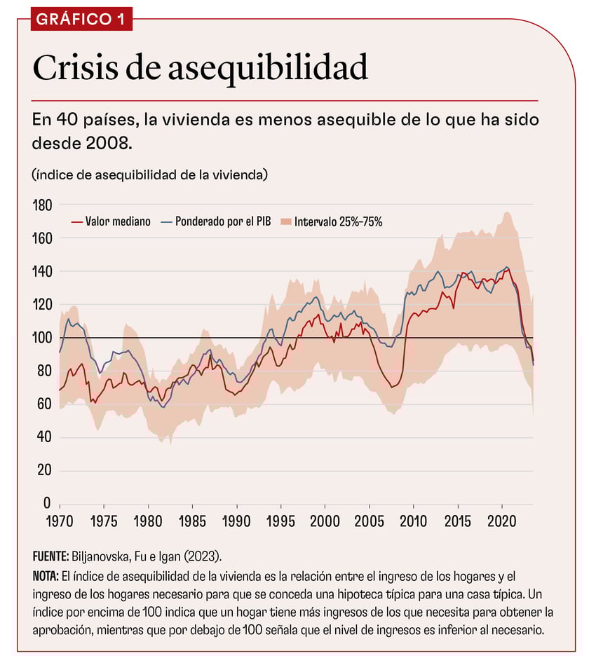 La crisis de la asequibilidad se debe al aumento de los costos de endeudamiento que se ha producido desde que los bancos centrales subieron las tasas de interés para frenar la inflación. Al mismo tiempo, la escasez de vivienda y la elevada demanda propiciada por una marcada conformación de nuevos hogares mantuvieron los precios en niveles altos. La compleja coyuntura económica tras la pandemia sacó a la luz problemas estructurales que llevaban mucho tiempo gestándose en el mercado mundial de la vivienda.