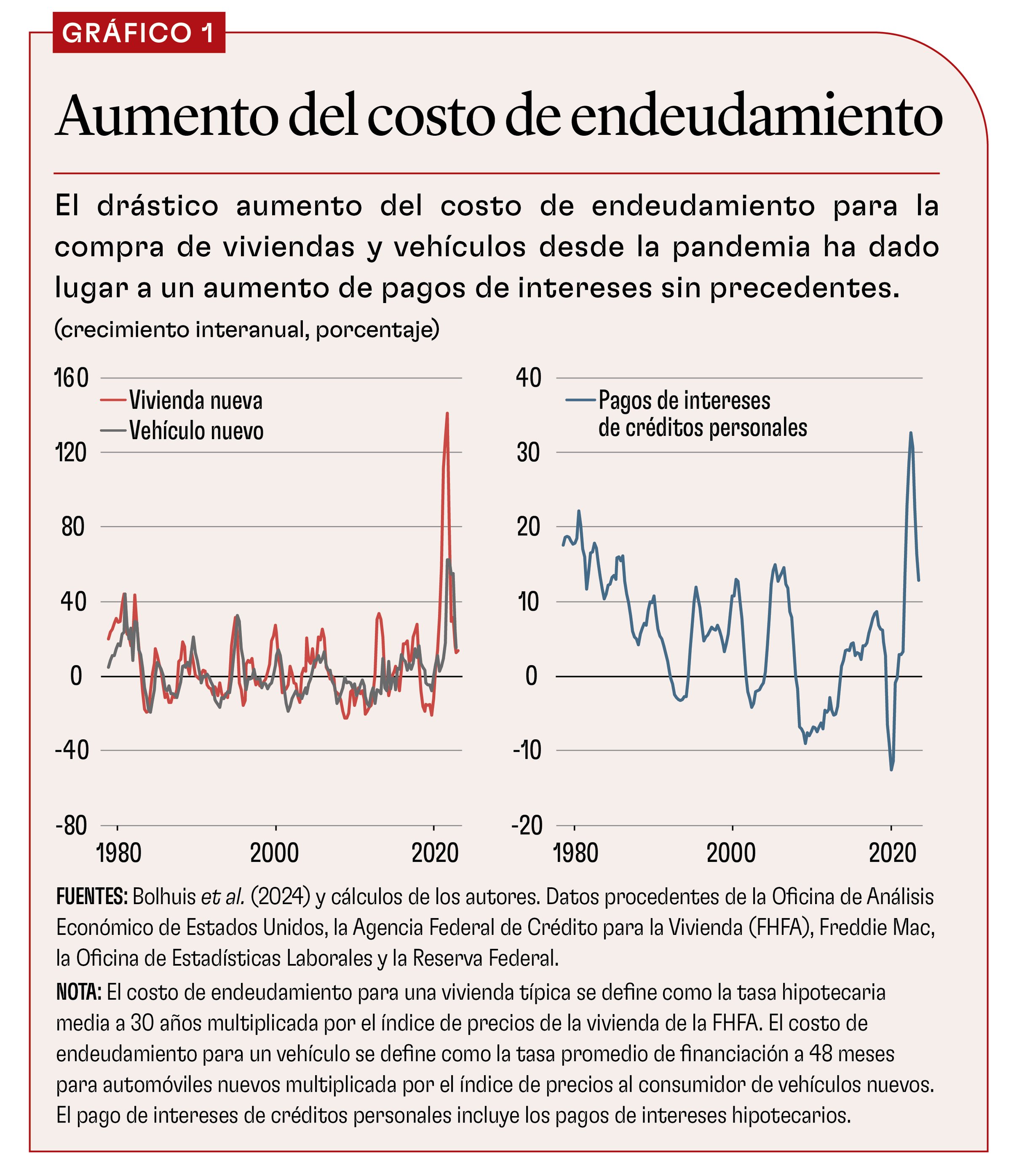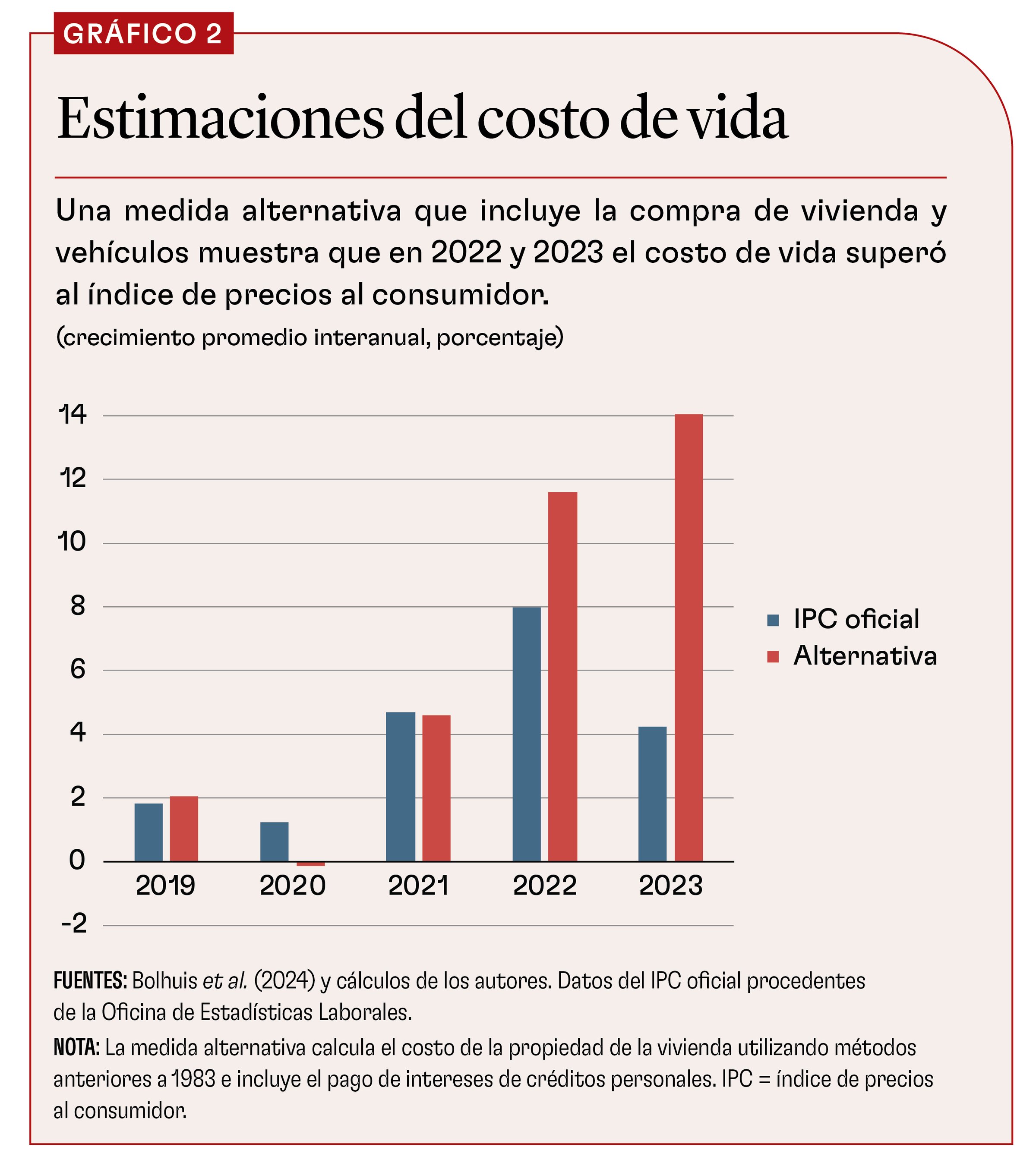 Por último, presentamos medidas alternativas del costo de vida que incorporan explícitamente el costo del dinero. La metodología actual de la Oficina de Estadísticas Laborales se basa únicamente en el mercado de alquiler para explicar los cambios en el valor locativo (Bolhuis, Cramer y Summers, 2022). Antes de 1983, el IPC incluía una medida del costo de la propiedad de la vivienda que reflejaba las tasas hipotecarias y los precios de la vivienda. Del mismo modo, las estadísticas oficiales no recogen el costo de los créditos para la compra de vehículos ni el pago de los intereses de otros créditos personales, por ejemplo, de deudas de tarjetas de crédito, lo que refleja con mayor exactitud los costos reales asumidos por los consumidores.