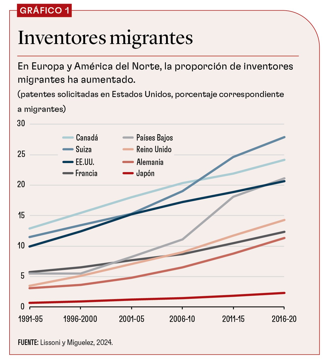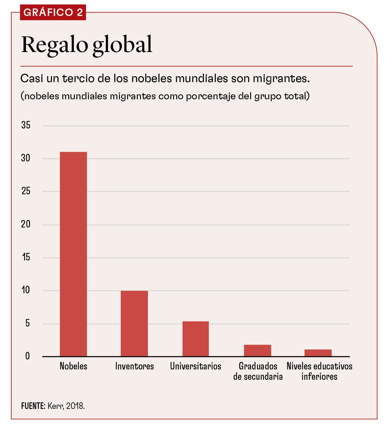 El vínculo entre migración y talento se sustenta en una serie de datos básicos. En primer lugar, la tasa de migración de las personas de enorme talento es superior a la de la población en general. Aproximadamente el 5,4% de los trabajadores con título universitario vive fuera de su país de origen; el porcentaje de los graduados de la secundaria es del 1,8%. Asimismo, la tasa de migración de inventores y nobeles es dos y seis veces superior a la de los trabajadores con título universitario, respectivamente. Así pues, en muchos países receptores de inmigrantes, una proporción elevada y creciente de la fuerza laboral calificada es de origen extranjero, sobre todo en campos relacionados con la ciencia y la ingeniería.