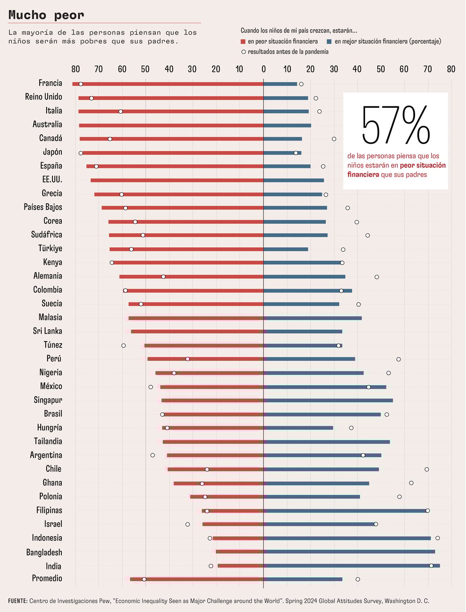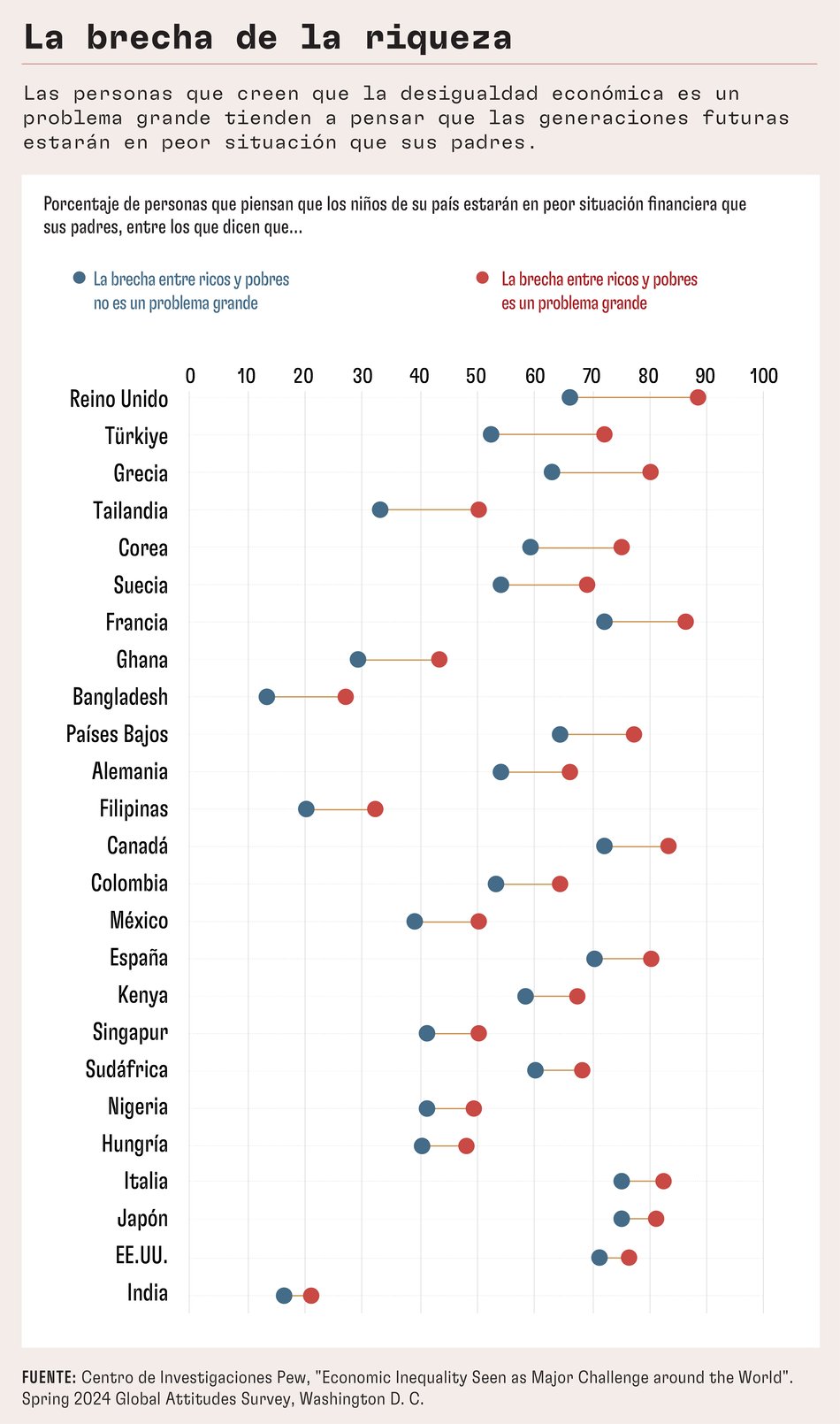 Según Pew, el pesimismo está vinculado a las percepciones de desigualdad económica. “En la mayoría de los países, las personas consideran que la brecha entre ricos y pobres representa un enorme problema y se manifiestan especialmente pesimistas acerca de la situación financiera de sus hijos cuando crezcan”, señalan los investigadores. En el Reino Unido, por ejemplo, el 88% de los encuestados que dice que la brecha entre ricos y pobres es un problema grande también piensa que los niños estarán en peor situación. Entre los que opinan que la brecha de riqueza no es un problema grande, solo un 66% piensa que la situación de los niños será peor en el futuro.