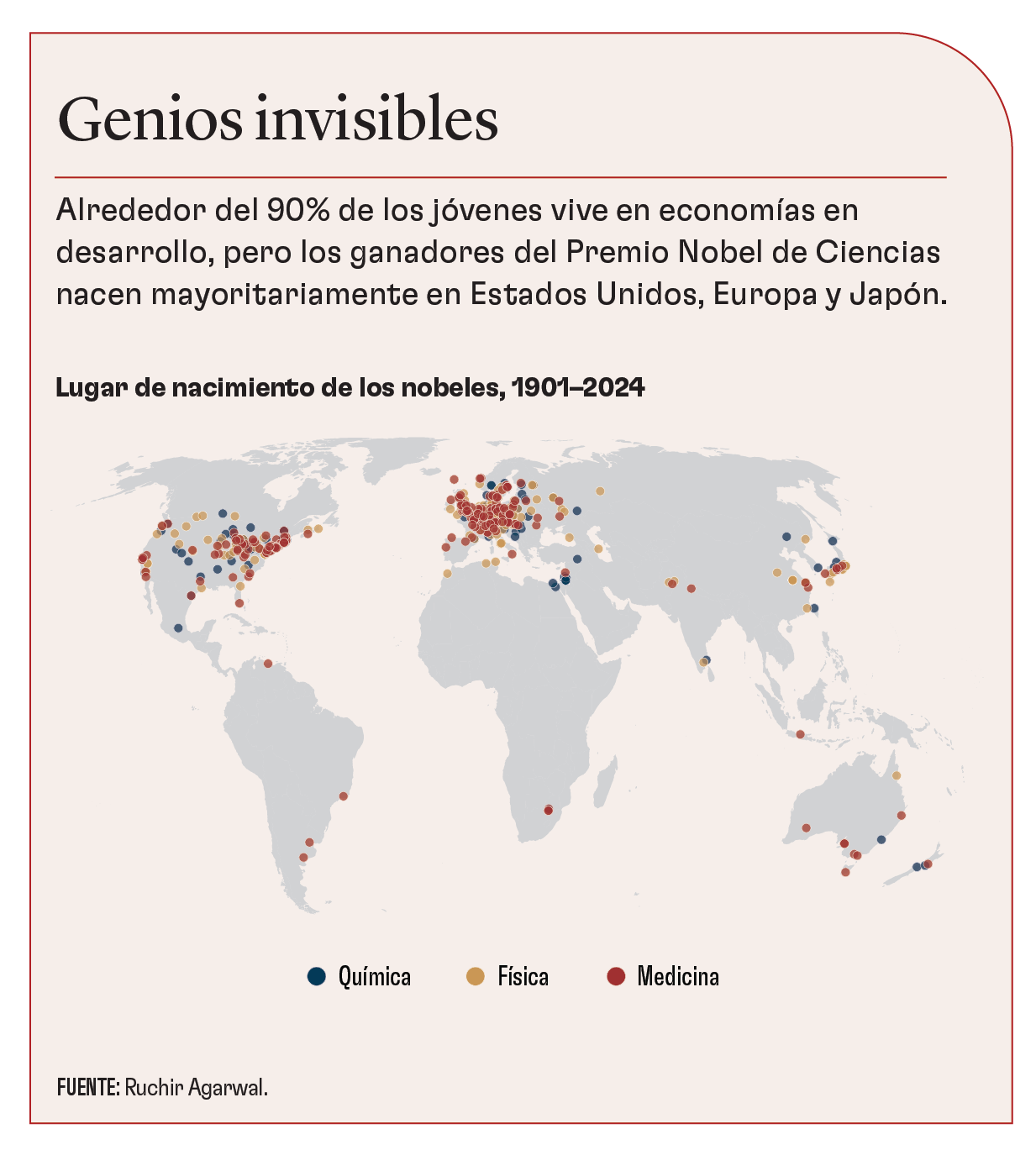 Y está claro que, a la hora de descubrir talento en el mundo entero, persisten graves deficiencias. Aunque alrededor del 90% de los jóvenes vive en economías en desarrollo, los ganadores del Premio Nobel en Química, Física y Biología proceden principalmente de Estados Unidos, Europa y Japón (gráfico 1).