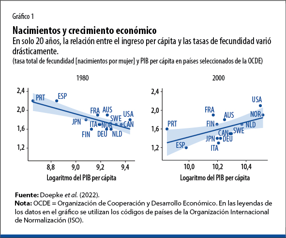 Durante mucho tiempo, un ingreso per cápita elevado en un país era indicación fidedigna de una fecundidad baja. En 1980, la fecundidad seguía estando muy por encima de los dos hijos por mujer en países más pobres, como Portugal y España, pero solo 20 años después, la fecundidad en el mismo grupo de países había cambiado sustancialmente (gráfico 1). De hecho, en 2000 Estados Unidos, el segundo país más rico de la muestra, tenía la tasa de fecundidad más alta.