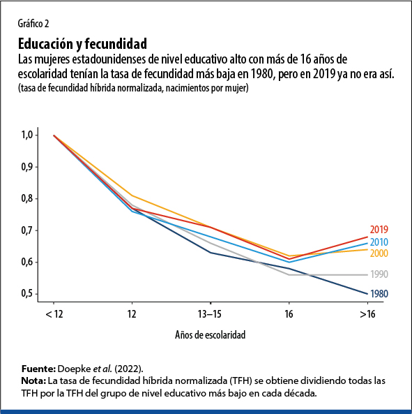 El patrón de fecundidad entre las familias en países de ingreso alto (como Alemania, Francia y Estados Unidos) también ha cambiado. Históricamente, la relación entre la educación de la mujer y la fecundidad ha sido claramente negativa, en consonancia con el hecho de que cuando los salarios son más altos aumenta el costo de oportunidad de criar hijos. Sin embargo, esta relación negativa es más débil en el caso de las mujeres estadounidenses de cohortes de nacimiento recientes (gráfico 2). Aunque las mujeres con un nivel educativo alto con más de 16 años de escolaridad tenían la tasa de fecundidad más baja en 1980, esto ya no era así en 2019 (véase también Hazan y Zoabi, 2015).