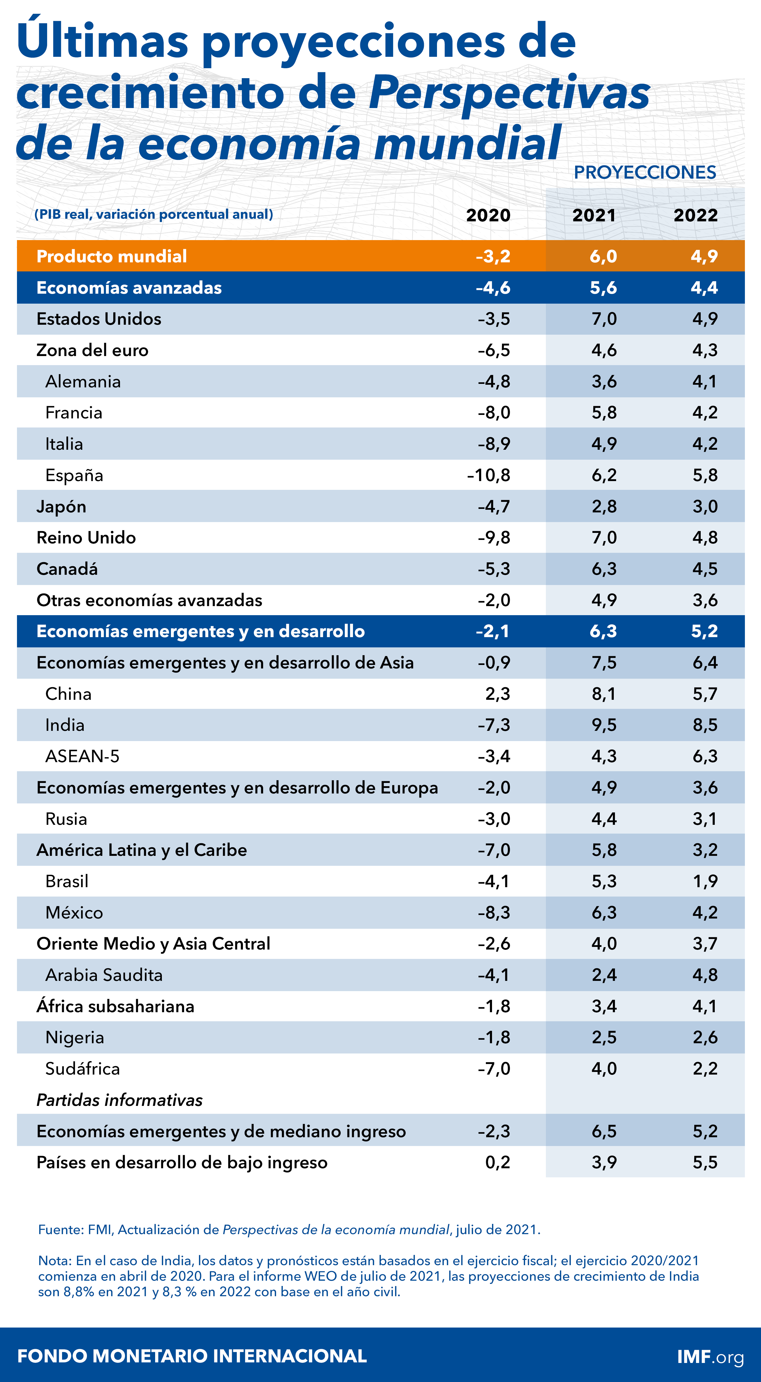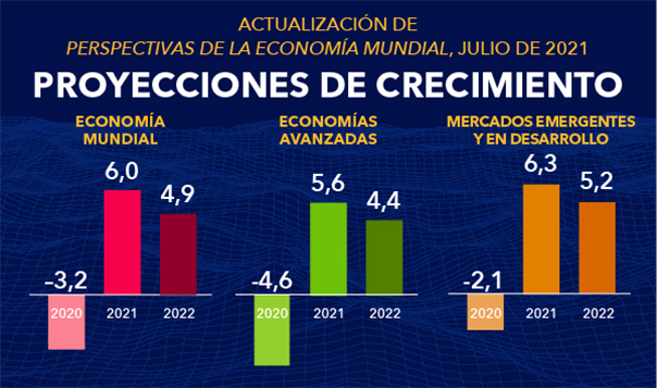 Se proyecta que la economía mundial crezca 6,0% en 2021 y 4,9% en 2022. El pronóstico mundial para 2021 no ha variado con respecto al del informe WEO de abril de 2021, pero las revisiones se ven neutralizadas. Las perspectivas de las economías de mercados emergentes y en desarrollo para 2021 se han revisado a la baja, especialmente para las economías emergentes de Asia. En cambio, las proyecciones para las economías avanzadas se han revisado al alza. Estas revisiones reflejan la evolución de la pandemia y los cambios en las políticas de apoyo. El aumento de 0,5 puntos porcentuales para 2022 se deriva principalmente de la revisión al alza del pronóstico de las economías avanzadas, particularmente Estados Unidos, que refleja la adopción prevista de legislación para proporcionar apoyo fiscal adicional en el segundo semestre de 2021 y una mejora de los indicadores sanitarios, en general, en todo el grupo.