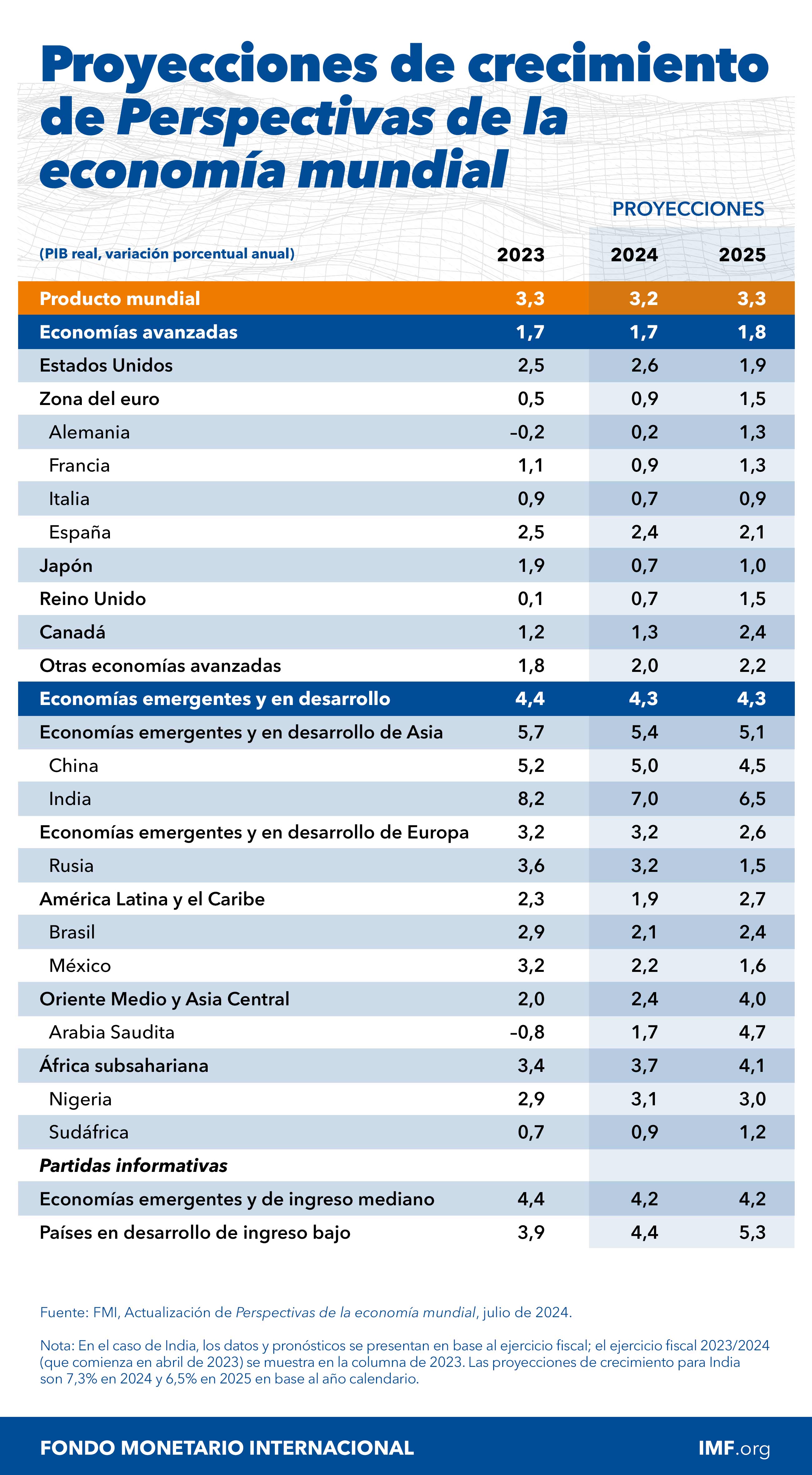 El crecimiento mundial proyectado, en línea con las previsiones de la edición de abril de 2024 de Perspectivas de la economía mundial (informe WEO), es del 3,2% en 2024 y del 3,3% en 2025.