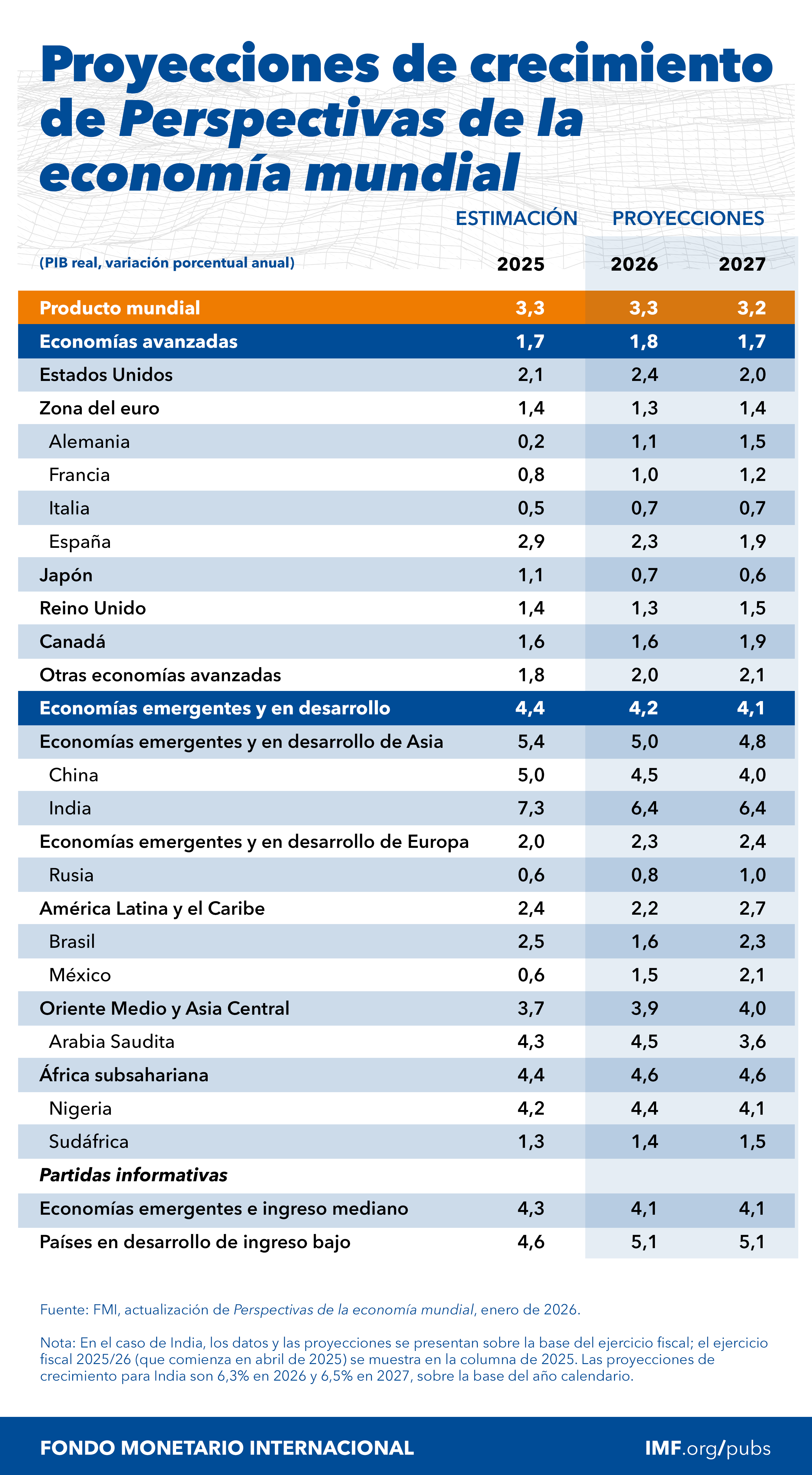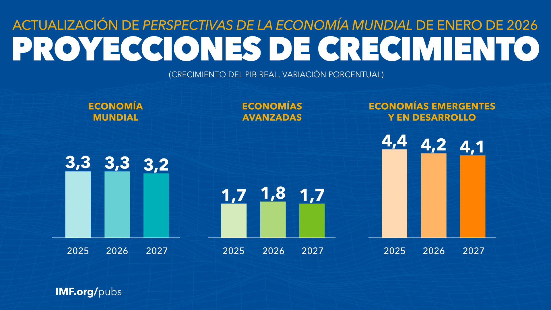 Las proyecciones de crecimiento mundial se sitúan en el 3,3% en 2026 y el 3,2% en 2027, una ligera revisión al alza desde la edición de octubre de 2025 de Perspectivas de la economía mundial. La inversión en tecnología, el apoyo monetario y fiscal, las condiciones financieras favorables y la adaptabilidad del sector privado contrarrestan los cambios en las políticas comerciales. Se prevé que la inflación mundial descienda, si bien la inflación en Estados Unidos retornará más lentamente al nivel fijado como meta. Los principales riesgos son un reajuste de las expectativas sobre tecnología y una escalada de las tensiones geopolíticas. Las autoridades deben reponer los márgenes de maniobra fiscal, preservar la estabilidad financiera y de precios, reducir la incertidumbre y ejecutar reformas estructurales.
