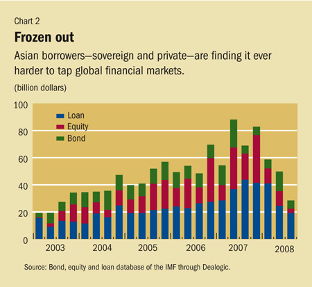 Capital outflows have also significantly weakened currencies in some countries, notably India, Korea, New Zealand, and Vietnam. And several countries have responded by intervening to support their currencies, in stark contrast to the past several years, when most Asian countries were concerned about the rapid appreciation of their currencies. With the rise in global risk aversion, Asian governments, corporations, and financial institutions have found it more difficult to access the global financial markets (see Chart 2). Countries with banking systems that rely more on wholesale financing and less on retail deposits (Australia, India, Korea, New Zealand) have experienced a higher rise in borrowing costs, partly because of concerns they will face difficulties rolling over their debts. As a result of these tightened conditions, the region's private external financing has fallen sharply.