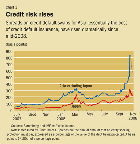 Domestic interbank and money markets have also come under stress from the global turmoil. In financial centers (Hong Kong SAR, Singapore, and Tokyo), interbank spreads over comparable government yields (so-called TED spreads) have risen, reflecting concerns about counterparty risk with foreign banks as well as a flight to quality. Spreads on credit default swaps for Asia—the cost of insurance against default on corporate bonds—have widened substantially (see Chart 3). The cash market for domestic structured products also remains effectively shut down as investors continue to turn away from securitized instruments. Most worrisome for a region highly dependent on external trade is the mounting evidence that trade financing is drying up. Finally, the global shortage of dollar liquidity is spilling over to affect local currency markets, such as those for swaps and repurchase agreements, leading to some market dysfunction and higher domestic funding rates.