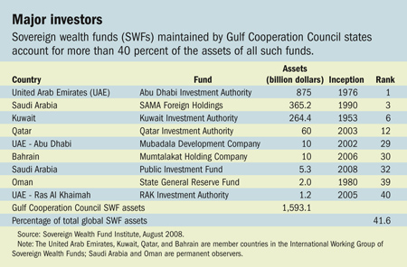 Neighbors feel the impact • Trade in goods. This remains a relatively unimportant area. Trade among Arab countries grew to 11.2 percent of their total trade in fiscal year 2006–07, but at that level does not play a major role in cross-country benefits. During the 2006–07 period in Egypt, for example, Arab trade accounted for only 9.6 percent of Egypt's total trade. • Trade in services. This produces a much greater regional revenue flow—through both remittances and tourism. Egyptians working abroad—including those in GCC countries—have significantly increased their remittances, contributing positively to the balance of payments position and to the welfare of the household sector in Egypt. According to the Central Bank of Egypt, remittances from Egyptian workers in GCC countries rose 160 percent between 2003–04 and 2006–07, from $1.21 billion to $3.13 billion. Their share of total remittances from Egyptians abroad rose from 40 percent to 50 percent during that time frame. Tourism has increased almost threefold since 2002, reaching $10.8 billion in 2007. About 20 percent of the tourists are Arabs. The Egyptian Ministry of Economic Development estimates that each tourist dollar spent ultimately generates $4 or $5 in income, which suggests a strong impact on incomes and the standards of living of workers in the tourism sector and sectors linked to it. • Investment. Some of the GCC capital that had been invested in the United States and Europe has been redirected to Arab countries, making it the most effective channel between the GCC and neighboring countries. Countries such as Egypt, Jordan, and Morocco have benefited, becoming attractive investment destinations for GCC states (Institute of International Finance, 2008). Large current account surpluses, along with investments by corporations and wealthy individuals, have allowed a significant portion of GCC investments to take place through SWFs (see table). Gulf-based SWFs have shown an interesting appetite for hybrid financial instruments, in addition to their traditional use of reserve surpluses to make longer-term private equity investments.