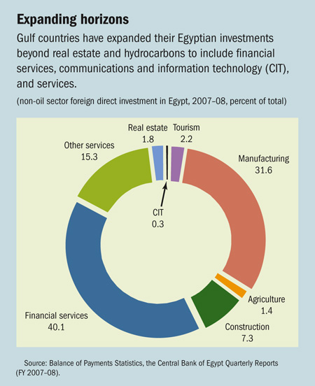 Foreign direct investment (FDI) is the avenue of choice for most of the funds GCC states invest in their neighbors—much of it linked to privatizations, large infrastructure projects, and new equity investments. The share of GCC funds in total FDI in Egypt—the largest recipient of FDI from GCC states—increased from only 4.56 percent in 2005 to 25.2 percent in 2007. But it is not just the increase in volume of FDI that was notable during this period. The pattern of Gulf investments and their diversification in the neighboring economies changed as well (see chart). In the 1970s and 1980s, Gulf investments were more concentrated in real estate development and activities associated with the hydrocarbon sector. Higher oil revenues allowed GCC governments to diversify their economies away from hydrocarbons and adopt more ambitious investment behavior, which included spending generously on domestic infrastructure as well as buying stakes in companies in developed and emerging markets. Even with the diversification moves, however, hydrocarbon industries still represent more than 80 percent of total government revenues, and the share of hydrocarbons in the GDP of GCC countries has actually risen—from 36 percent in 2002 to about 50 percent in 2007. Currently, through partnerships with companies based in industrial countries and their accumulated cooperative experience in GCC countries, Gulf investments in Egypt have expanded beyond their traditional areas to include manufacturing, organic farming, communication and information technology, financial services, and logistics.