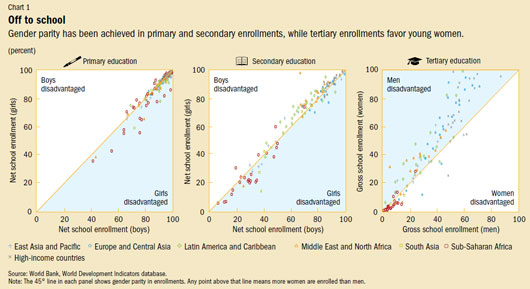 In primary education, the gender gap has closed in almost all countries, and it is shrinking quickly in secondary education. Indeed, in almost one-third of developing countries, girls now outnumber boys in secondary schools. There are more young women than men in universities in two-thirds of the countries for which there are data: women today represent 51 percent of the world’s university students (see Chart 1). Yet more than 35 million girls do not attend school in developing countries, compared with 31 million boys, and two-thirds of these girls are members of ethnic minorities.