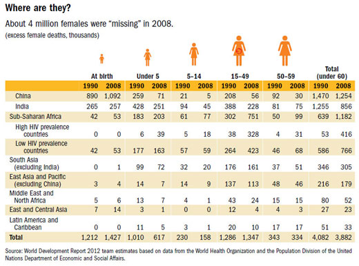 Since 1980, women have been living longer than men in all parts of the world. But across all developing countries, more women and girls still die at younger ages relative to men and boys, compared with rich countries. As a result of this “excess female mortality,” about 3.9 million girls and women under 60 are “missing” each year in developing countries (see table). About two-fifths of them are never born, one-sixth die in early childhood, and more than one-third die during their reproductive years. Female mortality is growing in sub-Saharan Africa, especially for women of childbearing age and in the countries hit hardest by the HIV/AIDS pandemic (World Bank, 2011, Chapter 3).