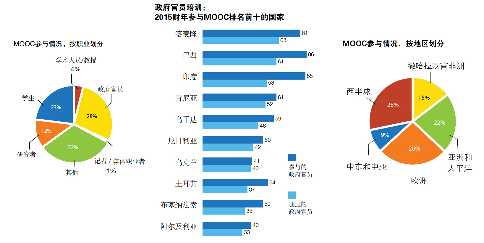 عربي 中文 Français 日本語 Русский Español Section Notes 聚焦点 通过在线课程扩大基金组织培训 基金组织在培训方法上迈入了一 个令人兴奋的新阶段,采用了与 edX合作设计的在线学习新课程。 edX 是哈佛大学和麻省理工学院 成立的非营利在线学习机构。合 作使得基金组织可以向更多成员 国的官员提供培训并且通过所谓 的大规模在线公开课程(MOOC) 让更多的公众可以学习基金组织 课程。 由能力发展学院会同基金组织其他部门建立的新课程的设 计含有穿插测验和实际动手操作练习的简短视频内容以及 一个讨论平台,允许学员联网并讨论课程内容。电脑评分 的使用节省了教员的时间,并且意味基金组织实际上可以 允许无限量报名。自项目于2013 年末启动以来,任何人 通过英特网连接便可以免费学习的公开课程吸引了10,000 多名学员的积极参与,其中约6,000 人获得了结业证。 低收入发展中国家的新机遇 在线学习正为更大范围的国家官员提供培训机会。截至目 前,40% 的在线毕业者是政府官员,将2015 财年的基金 组织培训提高了4 个百分点。在接受该培训的人员中,来 自撒哈拉以南非洲国家的官员最多,这推动了培训分配朝 那些面对面培训代表性不足的地区转移。在线培训还在向 低收入发展中国家的官员转移,他们接受了2015 财年几 乎一半的在线培训,而其接受的面对面培训略低于40%。 MOOC 充当着基金组织对外宣介的重要渠道:五分之四 的学员一致认为课程加深了他们对基金组织及其工作的了 解。课程受到了热烈欢迎,学员们对基金组织公开提供此 类培训表示感谢。通过让青年人参与(四分之一的学员是 学生)和分享知识,MOOC 可以帮助多样化的全球受众 更好地认识他们本国和全球的经济政策。 截至目前,在线课程内容如下: 金融规划与政策, 第一部分:宏观经济账户和分析(FPP.1x) 提供了金融 规划的入门内容,介绍了组成宏观经济的四大部门(实体、 财政、对外和货币)账户的主要特征及其相互之间的关联。 债务可持续性分析(DSAx) 全面综述了基金组织和世 界银行采用的债务可持续性分析和中期债务管理的战略 框架。 能源补贴改革(ESRx) 以基金组织近期出版的《能源补 贴改革 :教训与启示》一书中报告的大量跨国分析为基 础,就如何最好地实施旨在降低国家能源补贴的改革提 出建议。 即将提供的课程包括“宏观经济预测”、“金融规划与 政策(第二部分):规划设计”和“金融市场分析”。“金 融规划与政策(第一部分)”已被翻译成法语,并将在 2016 财年翻译成西班牙语和俄语。 亲自了解 免费课程网址如下: https://www.edx.org/school/imfx